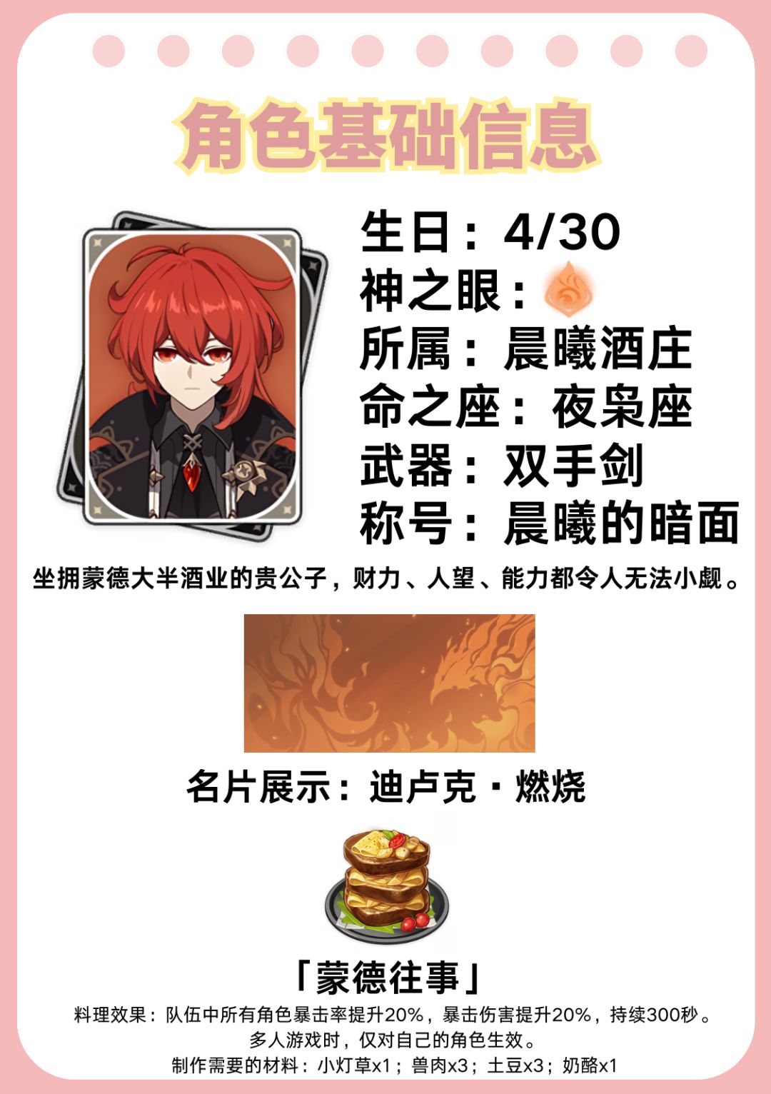 UID:229281934 本篇攻略带来七位常驻五星角色的攻略,希望对各位旅行者有所帮助~ 一、迪卢克 部分内容详解: ①迪卢克的特色料理可以去蒙德主城区找莎拉(「猎鹿人」侍应生)获取。 ②圣遗物选择方面,推荐首选炽烈的炎之魔女,能获取火元素伤害加成和火元素相关反应伤害加成,适配迪卢克输出特点,无妄引咎密宫:寒霜Ⅲ至Ⅳ有概率掉落; 暂时不能挑战这个秘境也没关系,可以选择战狂进行过渡,在提升暴击率的