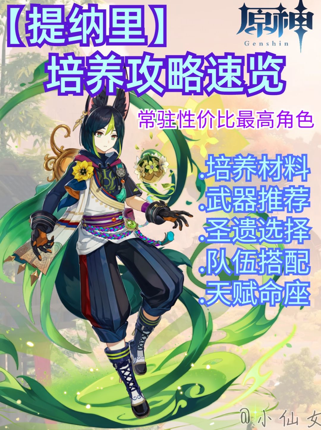 uid:247441820 哈喽,旅行者们好呀[表情_大笑] 这里是小仙女攻略噢 本期给大家带来的是提纳里角色培养攻略 大家常驻自选五星都选的谁呀? 如果选提纳里的赶紧来看看怎么培养吧 提纳里,五星弓箭草系常驻角色,定位为草系主C。目前主要是以激化反应作为主要反应的主C角色,强度在常驻角色里属优秀级别,适合地图探索和一般副本使用。 #原来你也玩原神 #原神 #原神创作者激励计划 #原神攻略 #游戏