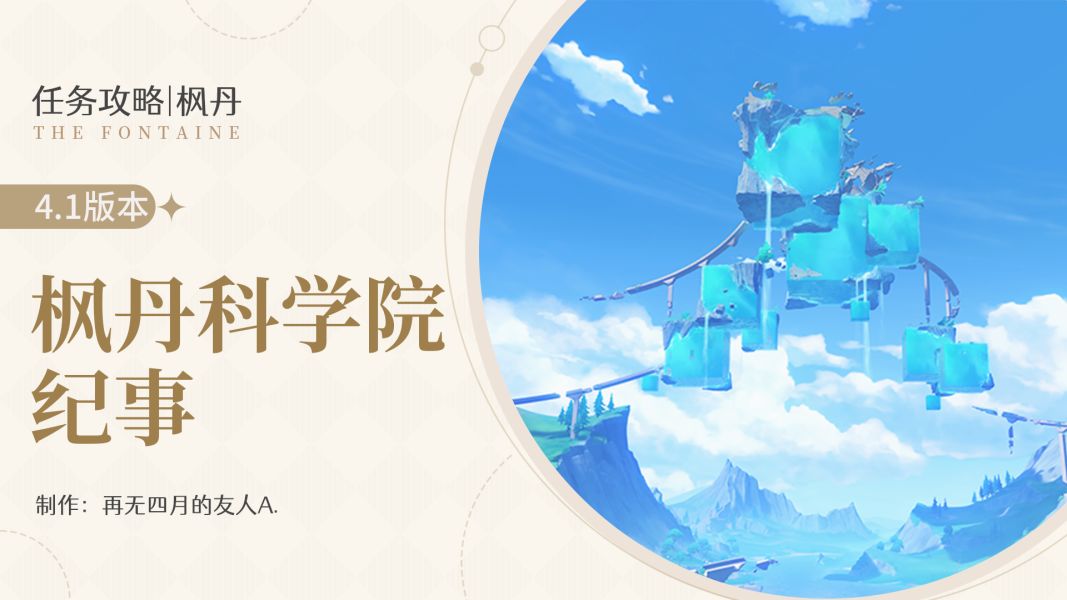 UID 100298809 旅行者们好,这里是友人A的任务频道。 本篇记录了4.1版本新增世界任务「枫丹科学院纪事」的关键流程,旨在帮助旅行者快速完成任务,获取奖励。该任务共包含四个部分,本篇为第一、二、三、四部分。 〓任务概况〓 -任务奖励:原石*110 -任务时长:大约1小时 -任务简介:在相关NPC的带领下,解决枫丹科学院的一系列问题。在任务途中了解枫丹科学院的往事与现状。 〓任务流程