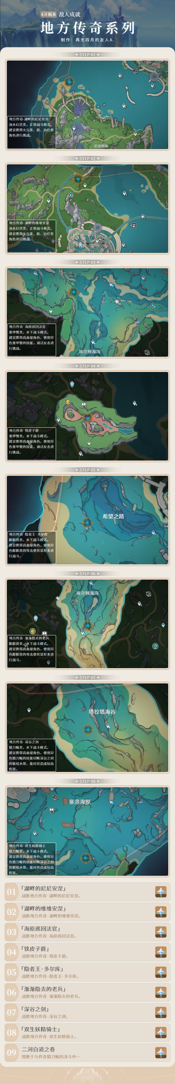 UID 100298809 ◎敌人成就 以下是在枫丹地区击败敌人或在某对某一敌人达成特定目标时才能获得的成就,共14个。 -地方传奇 在4.0版本枫丹地区一共有8个地方传奇敌人,它们实力强大,相较于普通魔物不容易击败。 下图是8个地方传奇的位置,由于部分敌人会移动,所以图中位置仅为大致标记,旅行者前往图中地点后若没有第一时间发现,请在附近寻找一番。 这8个地方传奇可分为4种类型,其应对方法也如下