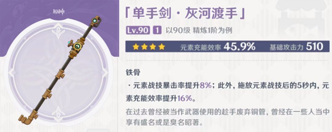 由于特殊个性的外观,灰河渡手这把新武器有很高的人气,今天就给大家带来的是4.0枫丹新增钓鱼获取武器,单手剑灰河渡手的测评。 灰河渡手(以下简称水管),单手剑,四星中白字,副属性提升元素充能效率。武器特效为提升元素战技的暴击率,并且在释放元素战技后,提升自身的充能效率。 从水管给予的属性能看出来,这把武器注重的要点是装备者的充能,满精能够获得45.9%+32%≈78%的元素充能效率,给的非常多,基本
