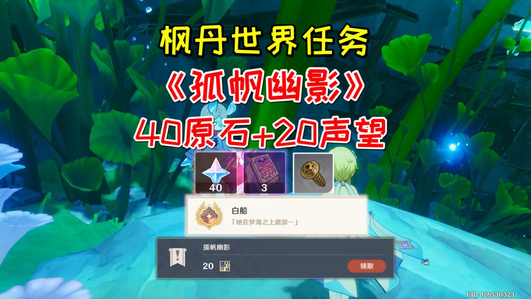 【原神】枫丹世界任务《孤帆幽影》,40原石+20声望+1成就
