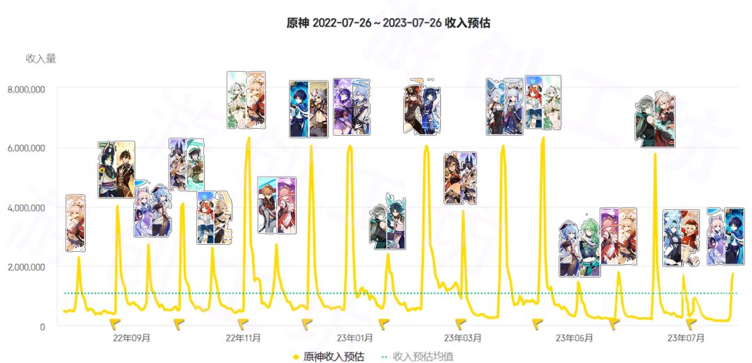 哈喽坊宝子们,最新卡池珊瑚宫心海&流浪者你抽了吗? 有多少粉球为她(他)们而留呢?这“鱼猫组合”卡池前两日的战绩如何呢?坊坊结合七麦、点点、蝉大师等数据统计网站的原神预估收入进行统计,整理出了原神一年内卡池走向图以及开服至今各卡池前两日流水的收益排行,由于数据为流水预估,因此仅供参考。 【原神一年内收入折线图】 整体来看,一年来纳西妲、雷神、胡桃、神里、夜兰、魈、万叶的热度相比其他角色高一些,且流