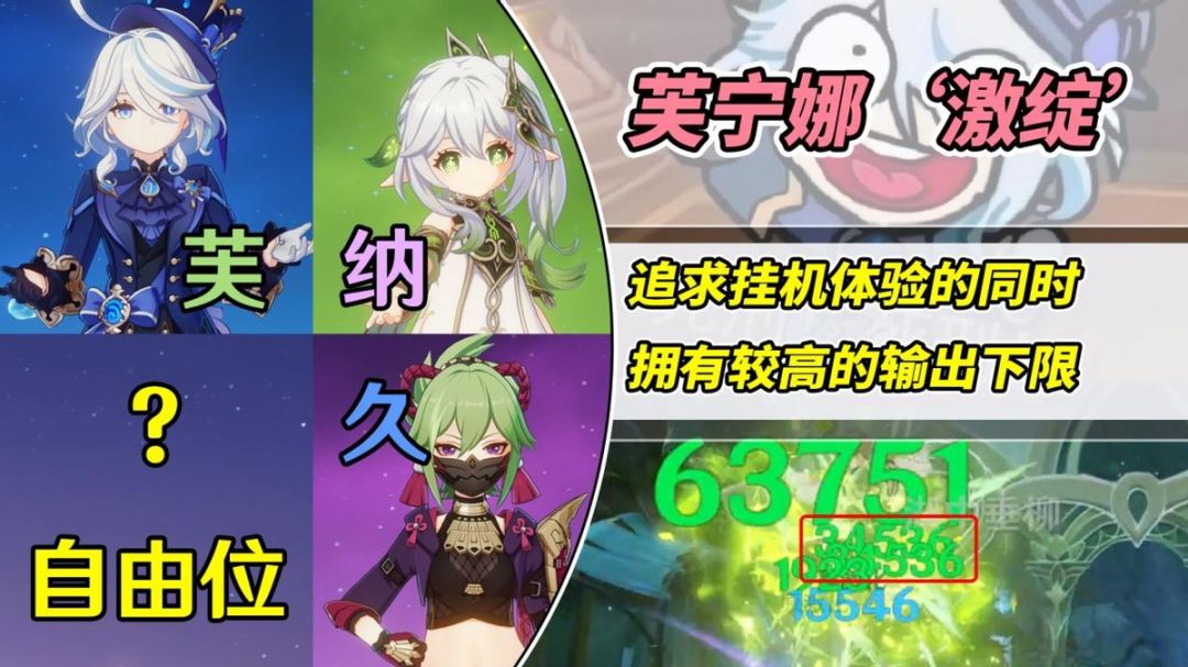 UID 101424396 这期来推荐一个挂机流芙宁娜激绽队,将‘摆烂体验的激绽队’与‘新晋万能辅助芙宁娜’结合,高下限、低操作,这不就是老咸鱼玩家们最爱的么? 配队建议 经过几种水雷草三系组合尝试,最终认为此队伍是比较有探索价值的:纳西妲、芙宁娜、久岐忍/雷电将军(千精)、4号自由位。 【4号自由位】由于前三位角色涵盖了基础所需,可以选择经典对敌破机制,或者去补全队伍的短板。如果是为了补短板,可