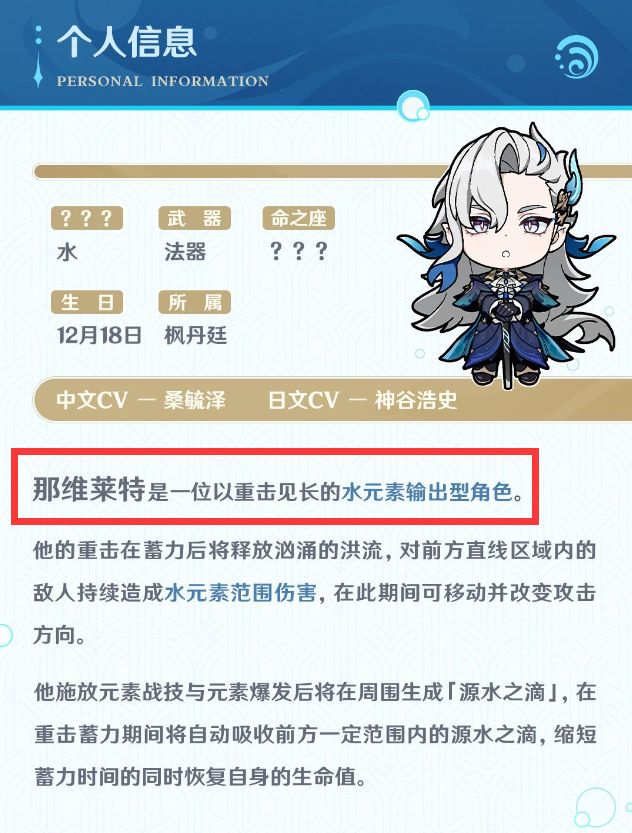 今天,原神官方公布了4.1版本新角色那维莱特的技能机制以及介绍,虽然目前还没有公布具体的倍率数值,以及命座效果等更加详细的信息,不过从那维莱特的技能机制已经可以看出一些端倪了,今天来跟大家一起分析一下。 一、 那维莱特的定位 关于那维莱特的定位, 在官方的介绍中已经说明得非常清楚了,“那维莱特是一位以重击见长的水元素输出型角色”,因此那维莱特的定位就是:水系主C,输出主要靠重击。 二、 那维莱特技