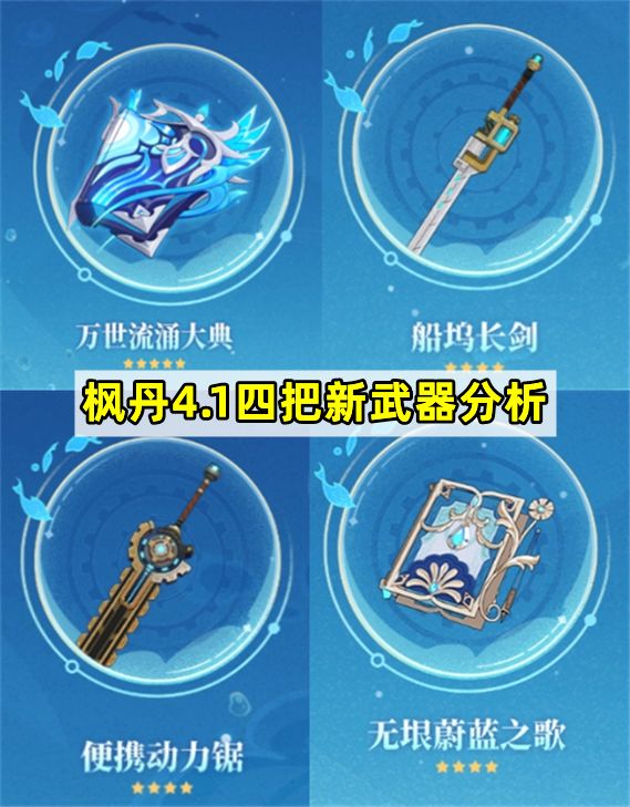 UID:100046414 就在不久前,官方公布了下版本(4.1)第一期新武器的具体属性,其中包括一把五星和三把四星武器。按照惯例,这四把武器应该都会出现在版本的上半,也就是4.1更新后就可以抽取或者通过活动赠送获得了。下面来具体分析下四把武器的属性和试用角色: 万世流涌大典,五星法器,结合卡池顺序、名字和外观来看,它是那维莱特的专武(以下简称专武)。满级面板542白值加88.2%暴伤;特性是常驻