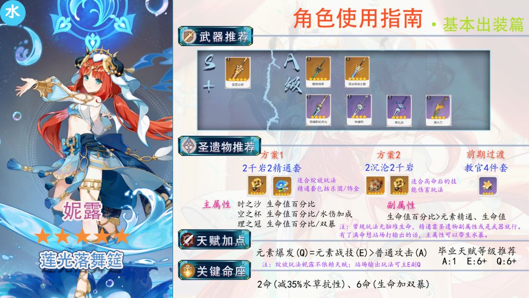 UID:130737586 好久不见,工作原因拖到版本末期才更新角色攻略。3.1版本池子末期,下版本又是保值性高的草神,相信很多人依旧在纠结妮露要不要抽。本期攻略会解析妮露的玩法与角色评估,彻底读懂这位角色之后,心里也就更有底了。 -----------------分割线----------------- 一.角色速读指南 首先是角色的圣遗物搭配、武器推荐和天赋加点等的方案。 说明:妮露因为自身