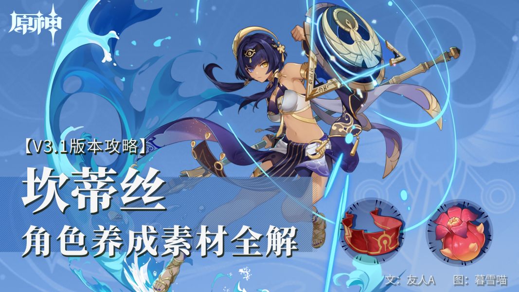 本文为TapTap首发,派蒙喵喵屋&原神冒险团联合创作 设计:流曳 文案:timesong blue ▌目录 1.角色定位 2.天赋技能 3.武器 4.圣遗物 5.命座 6.配队&手法 ▌P1 角色定位 【辅助坎蒂丝评价】 泛 用 性:★★☆☆☆ (目前能辅助的主C仅有绫人、赛诺比较合适,但同位置坎蒂丝也可替换成他人) 角色强度:★★★☆☆ (主要作用是提供40%左右的普攻增伤和水附魔,目前没有非