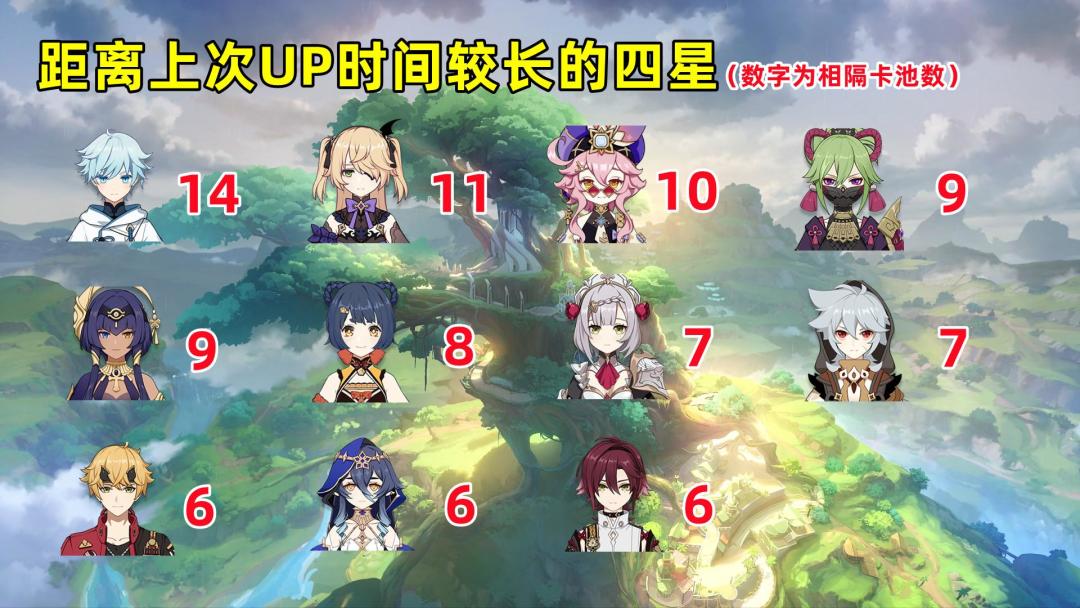 以往我的预测都是分版本上半下半,这回想尝试做点改变,将一整个版本的角色池和武器池四星的预测整合在一起。不过惯例还是先来回顾下3.5下半的卡池预测结果,角色池迪奥娜和砂糖均在预测范围之内,武器池方面唯一有些意外的是幽夜华夜兹没有出现,估计要等到和菲谢尔一起UP了,其余武器均预测成功,整体来说还算不错。 因此3.6版本的卡池四星预测,仍然按照以前总结下来的几个规律,角色池四星UP预测标准优先度依次为: