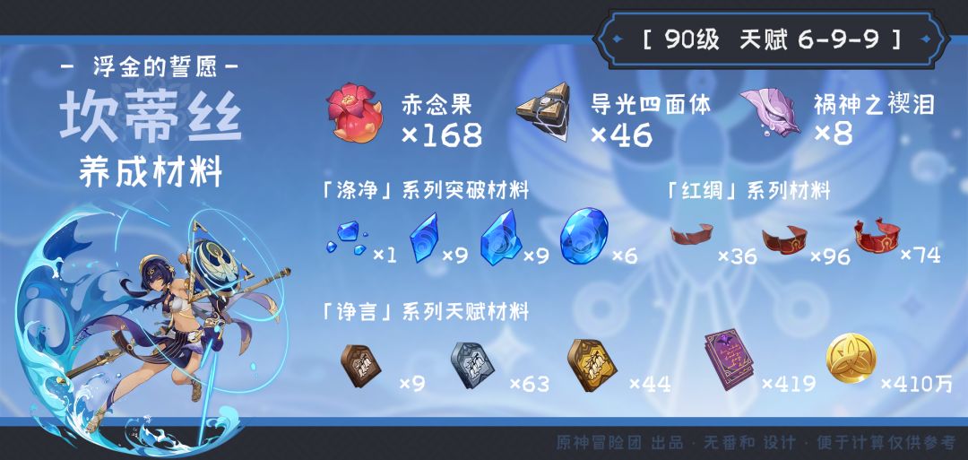 UID:105504822 作为大招具有元素附魔且具有普攻增伤效果的角色,坎蒂丝可以说是一名很强的专辅,辅助对象有宵宫、绫人、赛诺等,同时因为双水具有生命值上限提高25%的效果,对于不好配队的绫人也是一个很重要的队友,增伤效果也特别理想,根据坎蒂丝生命值上限增伤即可 那接下来就看看这名水系专辅的养成吧 目录: 一、养成材料 二、命座 三、天赋 四、圣遗物 五、武器 六、配队 一、养成材料 二、命座