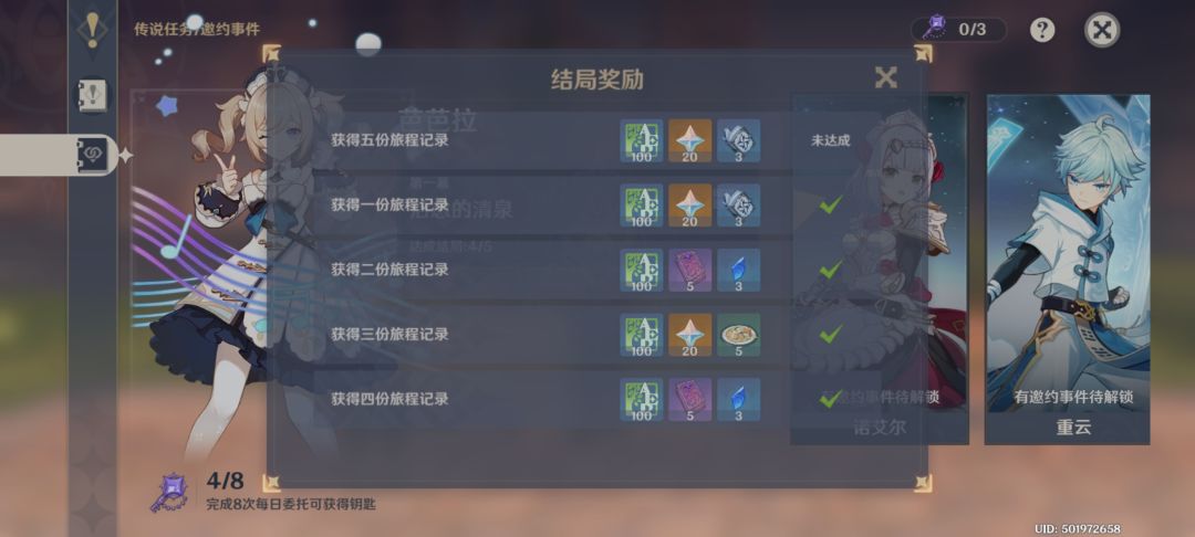uid:155515388(官服) uid:501972658(b服) 欢迎小伙伴找我一起玩 昨天刚开完,内容只更新了邀约事件,做完了芭芭拉和班尼特的全剧情,给大家走一走攻略 —————————————————————————————— 先来看看芭芭拉主线的全部内容,因为只玩了两个,感觉芭芭拉的主线长度还是挺长的,但是不用特别担心要反复重复五次完整的剧情,剧情是可以选择从中间某一段开始的,这个后面