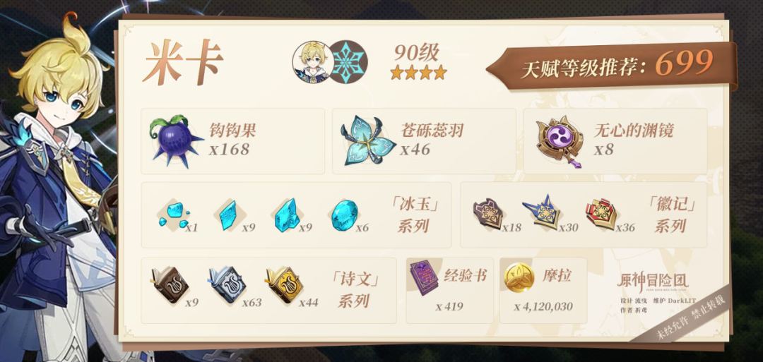 本期给大家带来的是,米卡所需的突破素材收集。 米卡是一位能够提升攻速和物伤,并兼具治疗能力的冰元素辅助型角色,等级天赋突破素材需要钩钩果、无心的渊镜、苍砾蕊羽、哀叙冰玉系列、徽记系列、诗文系列。 诗文系列:秘境-忘却之峡(周三/周六/周日) 苍砾蕊羽:风蚀沙虫boss(40体/次) 无心的渊镜:周boss散兵 哀叙冰玉系列:急冻树boss/无相冰boss(40体/次) 诗文系列天赋材料 位于忘却之