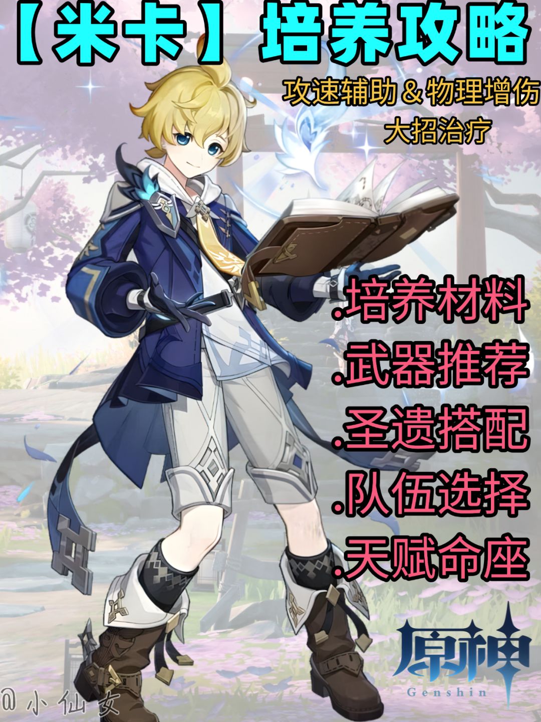 UID:130737586 在陆续推出了雷系(九条)、岩系(五郎)、冰系(申鹤)、风系(珐露珊)等专属辅助之后,策划又给出了物理系的专辅——米卡。相比前面几位专辅,米卡似乎功能性更多一些,且具有不错的治疗能力,完全可以充当队伍的奶妈角色。米卡的具体表现如何呢,以及对物理队的提升能有多大呢,本期攻略将一一解析。 一.角色速读指南 首先是角色的圣遗物、武器、天赋加点、以及阵容配队等的选择。#攻略#原神3.5