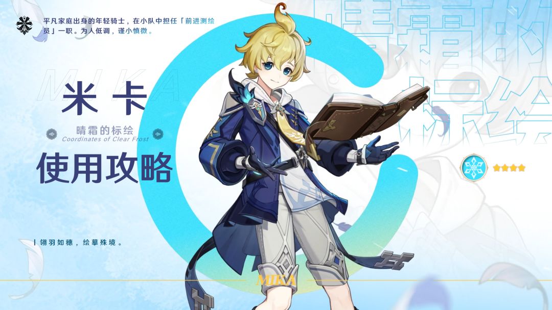 本文首发【提瓦特集中营】公众号,未经授权禁止“抄袭文章”转载至其它平台。 3.5版本原神共推出了10位奶系角色,而治疗型的角色在游戏中的定位也是十分关键的,能够极大的去缓解队友们的生存压力,除了最基本的治疗能力之外,大多也是同时具备了对输出视野的辅助能力,是我们能够应对强敌的额可靠后台。那么接下来ss就在现有的10位奶系角色中挑选了米卡给各位盘点一下。 米卡 【米卡】 米卡是一位冰系辅助角色,不但