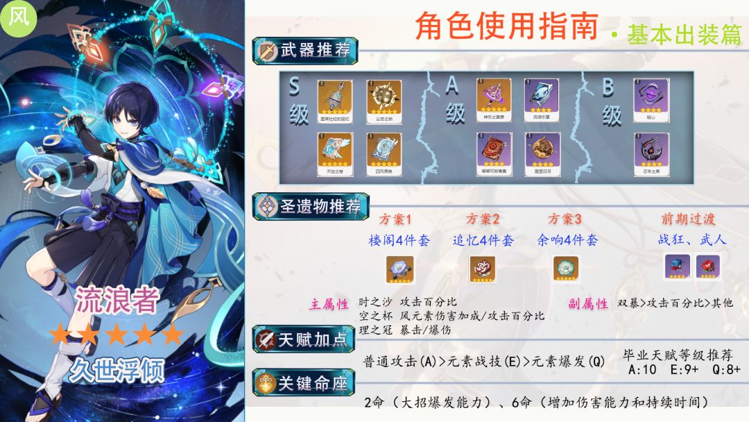 UID:130737586 又是在池子末期,才抽出时间来做角色攻略。本期攻略会对流浪者做一个详细的解读,已抽取的玩家可以看看能不能增加些新的认识;还没抽的呢,可以酌情决定要不要抽取。 -----------------分割线----------------- 一.角色速读指南 首先是角色的圣遗物搭配、武器推荐、天赋加点等的方案。 说明:圣遗物最优选择还是楼阁4件套,适用于各种玩法。法器角色普攻不