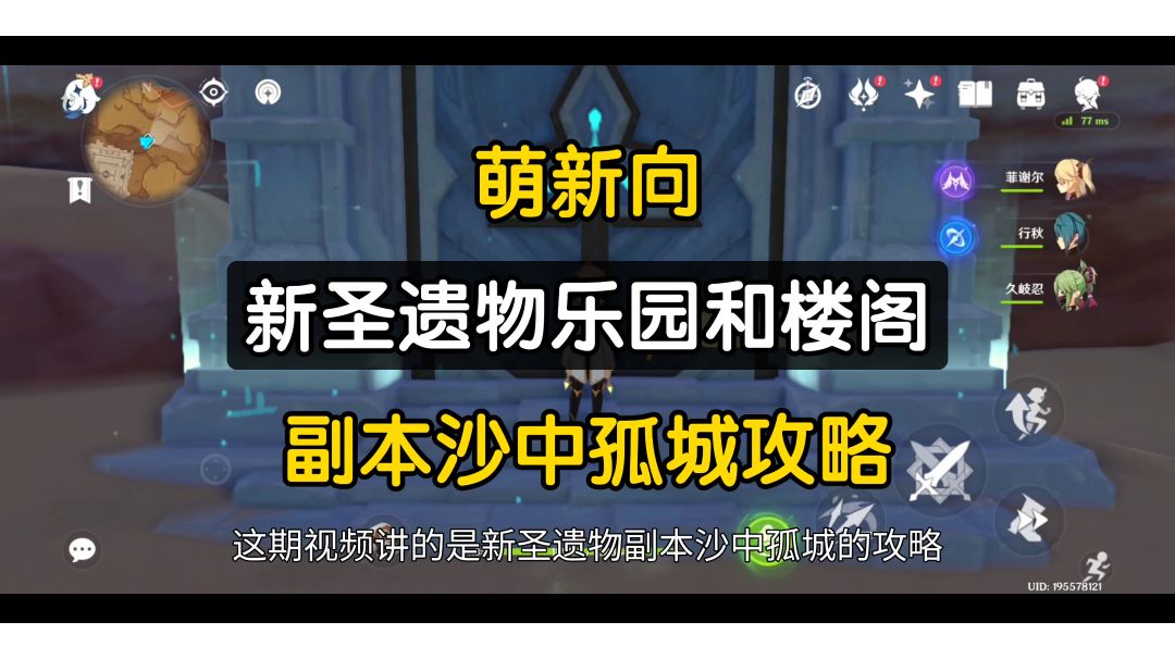 你好,我是狂人。 这期视频讲的是新圣遗物副本,沙中孤城攻略 主要针对萌新。 先讲一下怪物阵容,思路和应对方法 第一波一个火史莱姆加两个水帽子。他们主要打的是蒸发配合。 开局我们最好先把火史莱姆打死。如果一下子打不死,要注意躲避。尽量不要被水帽子挂水,否则可能火史莱姆瞬间蒸发蒸发蒸发。至于为什么强调这个请看视频第十五秒 第二波一个火史莱姆加一个水史莱姆加一个土豆。 他们主要打的是控制和蒸发,这个小土都会一直击退你,然后水史莱姆会冒泡泡控制。火史莱姆负责输出。 我们尽量先把两个史莱姆干掉如果不能两只一起打,随便打其中一只都行。 第三波一个冰鸟和水史莱姆, 他们主要思路是打冻结和冰伤。这个鸟他血量比较高,有时候会飞。最好先杀掉水史莱姆,在攻击水史莱姆的时候,要注意这个冰鸟的位置,他下来就闪避。如果不小心被冻住了。就连续点按屏幕解冻吧。 我推荐了四个队伍。萌新可以酌情选择。前三个有聚怪的队伍是比较好打的。只能看视频咯,不能发图 最后一个是为了照顾一个聚怪角色都没有的萌新,这里旅行者可以换成草神。行秋可以换芭芭拉心海。这里久岐忍堆精通。皇女圣遗物主要是攻击力和双暴。剩下两个位置没有要求。 我们开局之前最好先攒好能量。开局皇女一技能接大招。然后行秋大招接旅行者大招和一技能。切出九级人。开一技能和大招。然后行秋用一技能产草种子。a几下之后,皇女大招又好了。再往后就不用很讲究顺序了。哪个大招好了就先用哪个,如果大招都没好,就用一技能先充能。其实这个队伍本来就没有很讲究顺序。但是为了有点仪式感。我还是选择说一下。