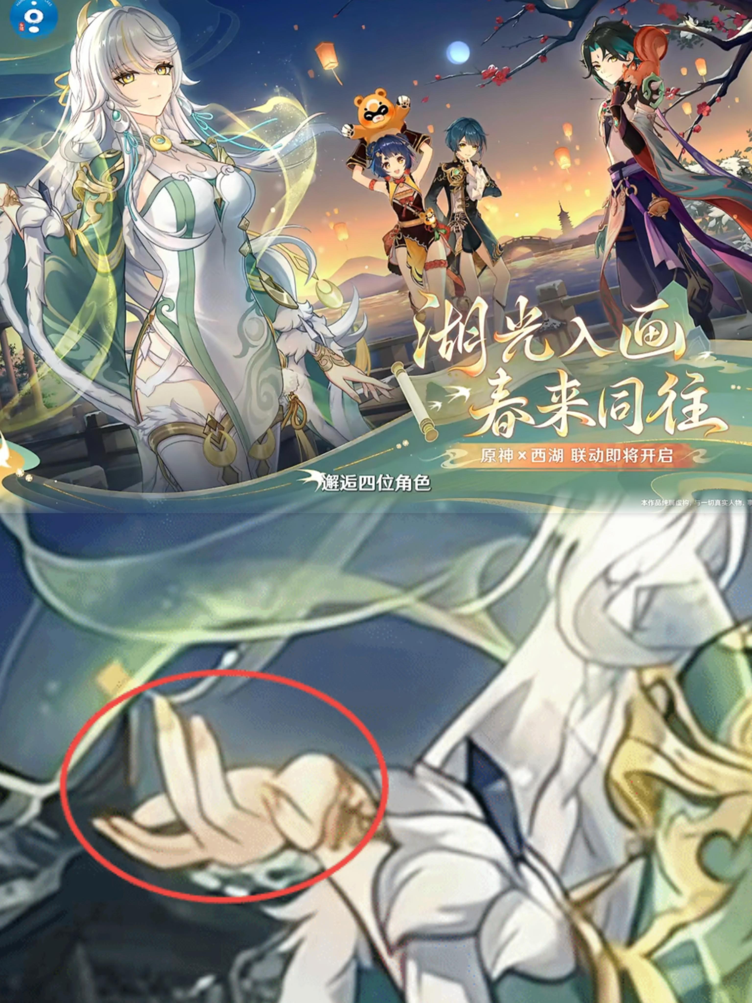 大的来了家人们!近日原神彻底又爆雷了!原神和西湖的联动宣传图一曝光就引发了热议!大家放大图一看,白马仙人的手居然有六根手指,图里的白马仙人立绘,不少人第一反应是AI作画翻车了吧。结果这时候有米学长出来甩锅,说是鸣潮玩家p图尬黑,故意挑事。但其实这些图都是真的,而且仔细看官方发的图的确是有6根手指!根本不是失误,也不是p图。有专业大佬发长文解释道多半是平台上传时画质压缩搞出来的乌龙,压缩后多了