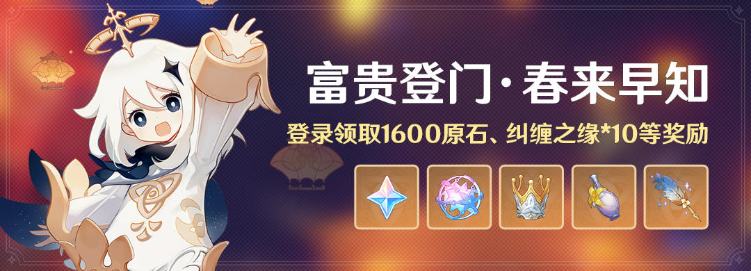 「富贵登门·春来早知」活动:登录领取1600原石、纠缠之缘等奖励