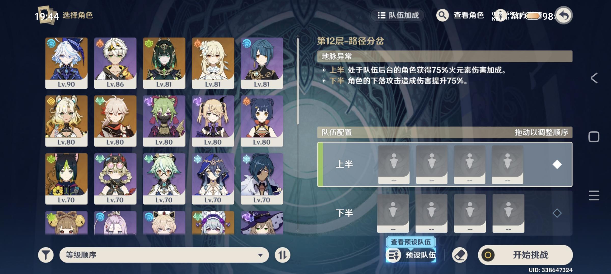 奈芙尔一脚2/2/3万,上半怪太多了打不完,冰盾也秒不掉只能芙带久其人万叶打感电然后加香玲破冰盾勉强能打,下半死活不行,只能一颗星,奈输出太低了,第三间还要破下落盾根本没辙,但是万叶在上半用了,怎么玩啊