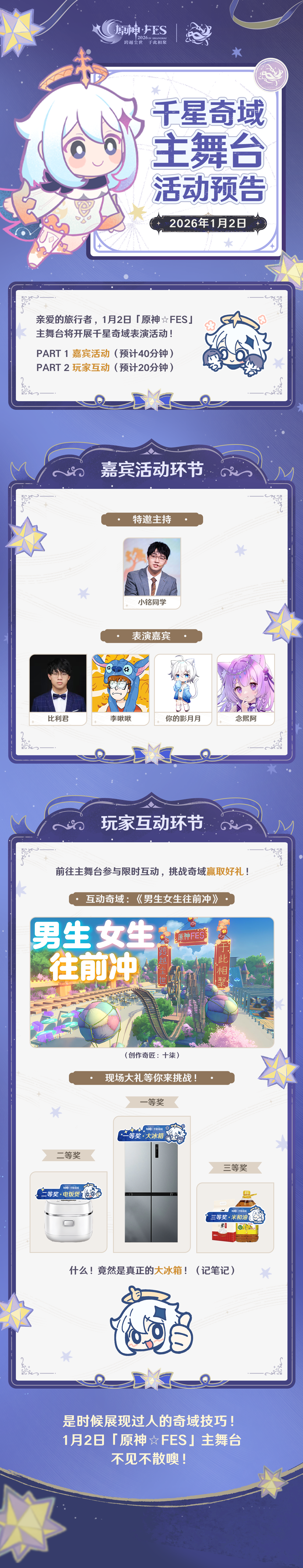 旅行者好呀!「原神☆FES」主舞台将于1月2日开展干星奇域特别活动~据前方可靠情报,活动现场竟然——竟然要送真正的大冰箱!是时候展现过人的奇域技巧了!1月2日「原神☆FES」主舞台不见不散噢!