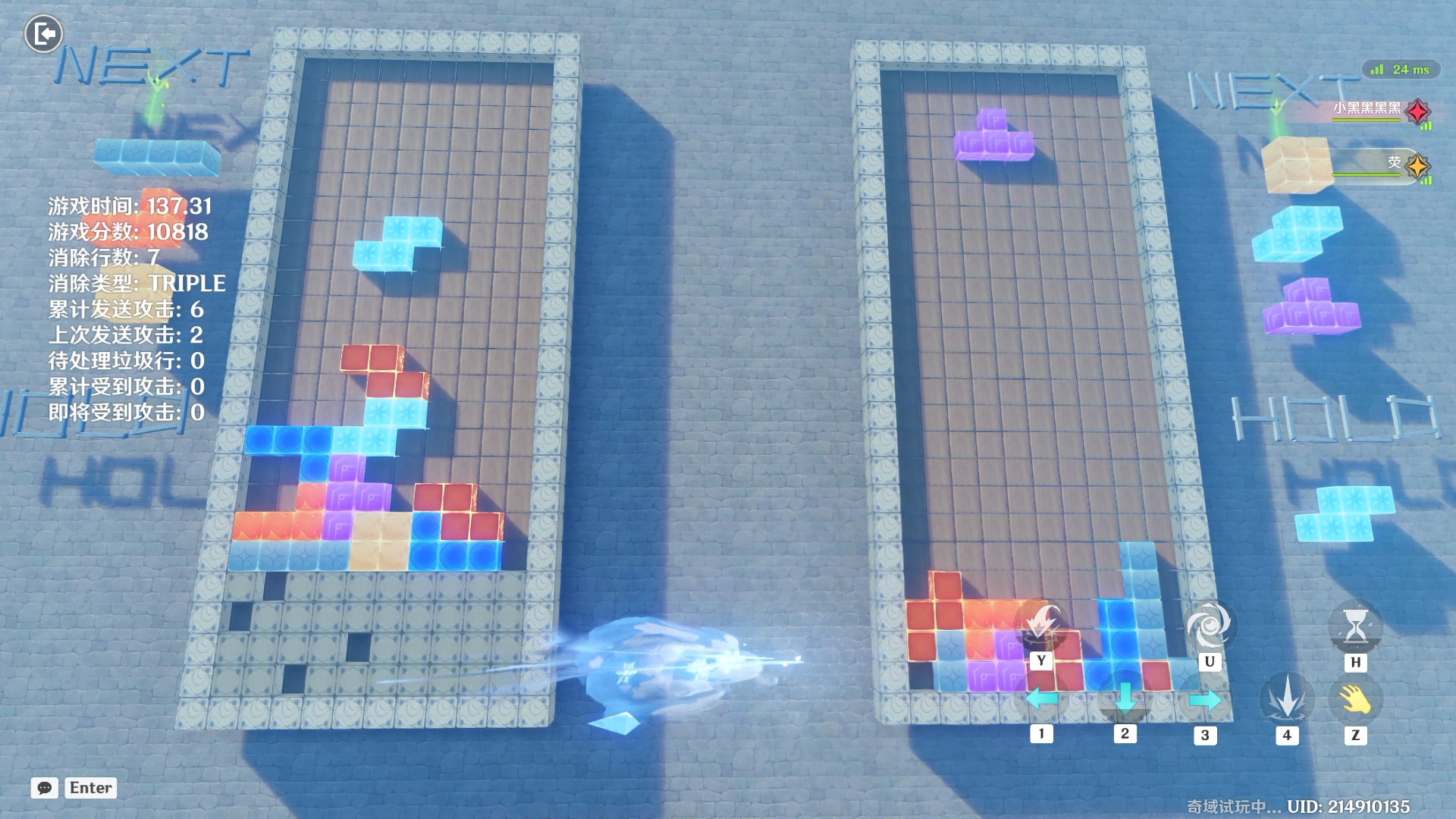 #原神 千星奇域关卡-俄罗斯方块多人竞技版是双人PVP版本的俄罗斯方块游戏。游戏支持SRS旋转系统和T旋、存储方块、预览方块、延迟锁定。游戏已经完全适配手柄,欢迎大家前来体验。俄罗斯方块双人合作版,官服GUID:24309874738,B服GUID:11721241120俄罗斯方块多人竞技版,官服GUID:28604842034,B服GUID:7426273824