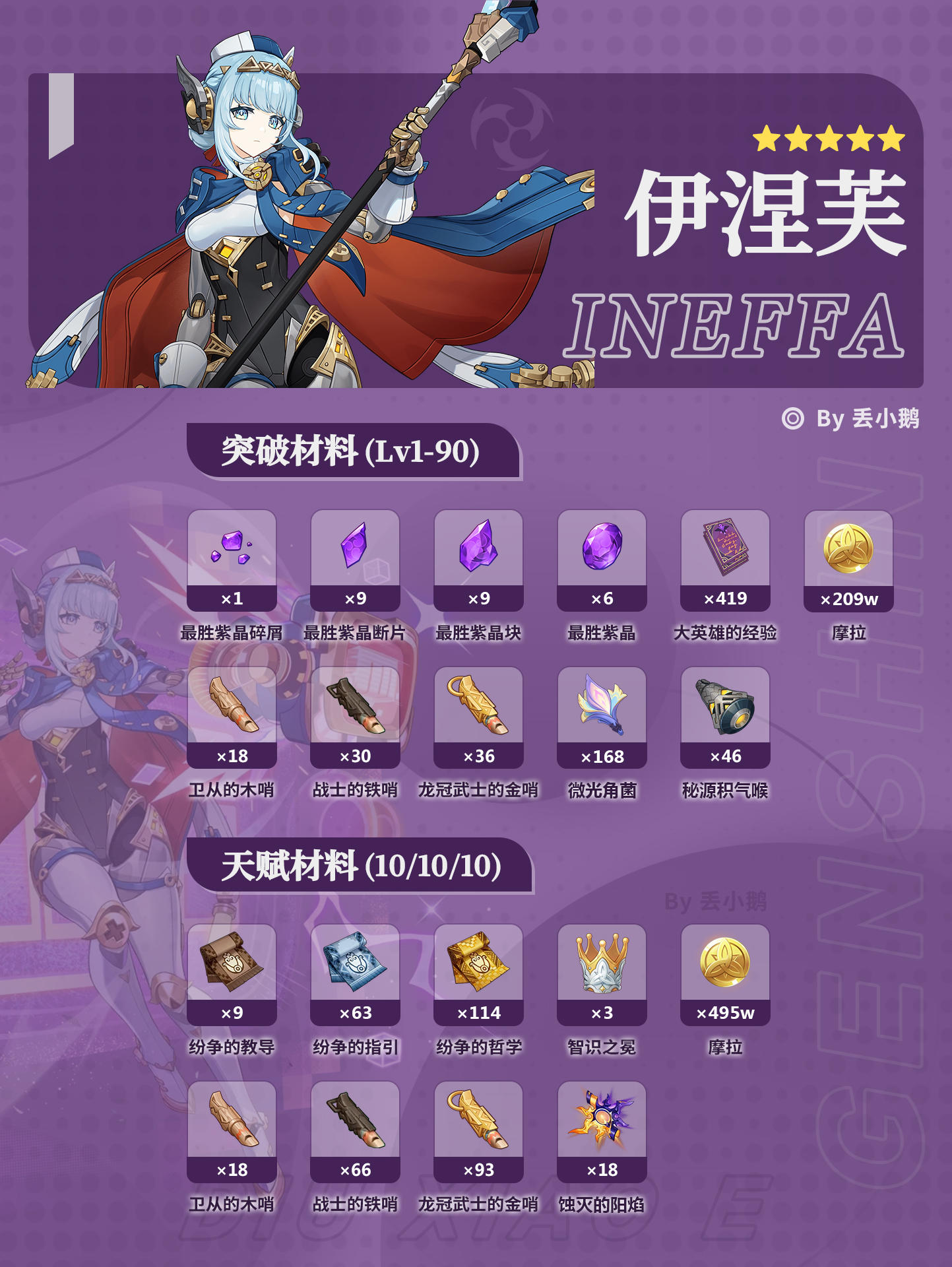 UID:220052599旅行者好,我是丢小鹅~为你带来【原神月之四】上半Up角色突破/天赋材料~⭐️月之四上半:哥伦比娅(新)、伊涅芙、赛索斯、菲谢尔、伊法● 元素石 ●获取方式:* 首领挑战奖励* 周本挑战奖励* 纪念品商店兑换* 合成台转换:如有其它元素材料,可在合成台转换(合成材料嬗变之尘获取方式:游戏商城 - 尘灰兑换 - 星辰兑换)● 区域特产 ●获取方式:*#伊涅芙