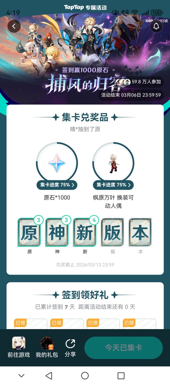 以后只要是1000原石+一个实体奖励活动,就不会拿到奖励的!!!1000原石+虚拟奖励(小额原石大概率拿到小奖励)签到过程的奖励大方点,从来没有拿到过奖励的,你这不是诈骗是什么?直接明说白了就是不想给!每一期我都参加,你们这就是给不起