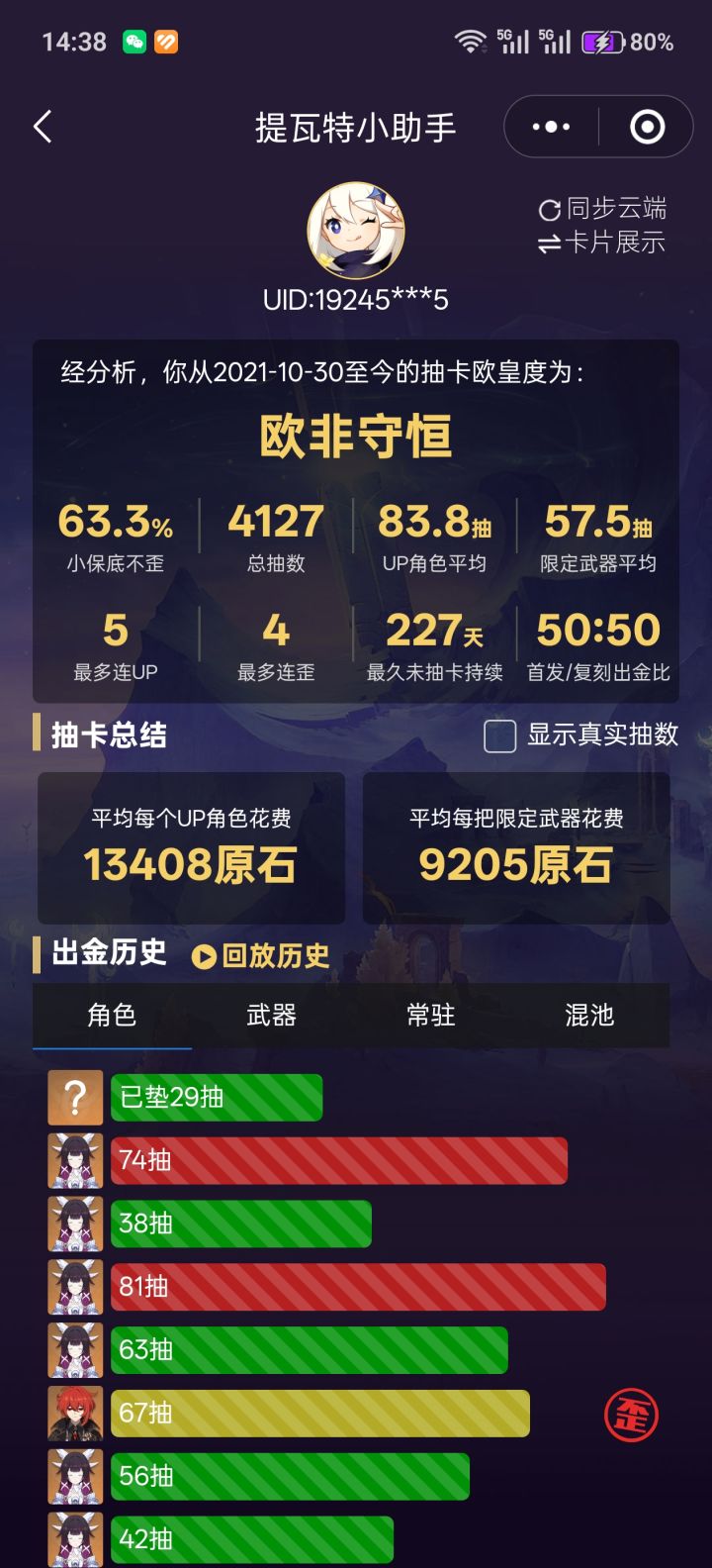 问问各位大佬,我应该怎么继续规划,我是上个月3号入的坑,赶尾抽了个滋白,一开始是因为他不怎么吃配队,所以开荒抽了她,后来实战发现手感太差,玩的难受,菲林斯复刻果断弄了个菲林斯,准备投资月感电,结果就在刚才20抽提前金了,歪了,所以各位大佬们推荐投资丝爱还是继续投资月感电,目前纳塔枫丹全是没怎么探索过就开几个锚点