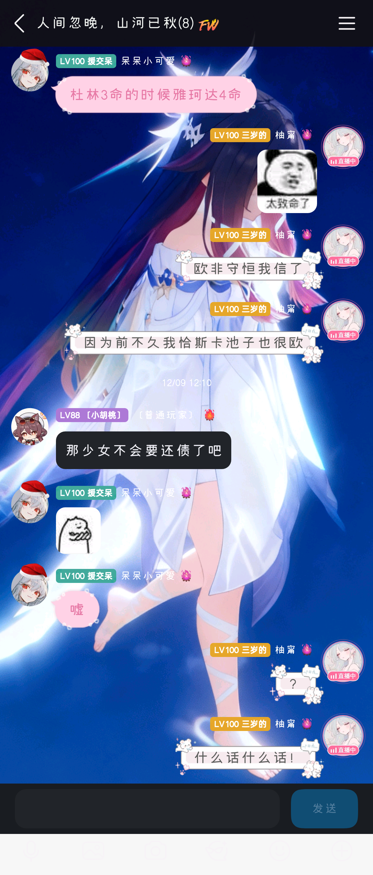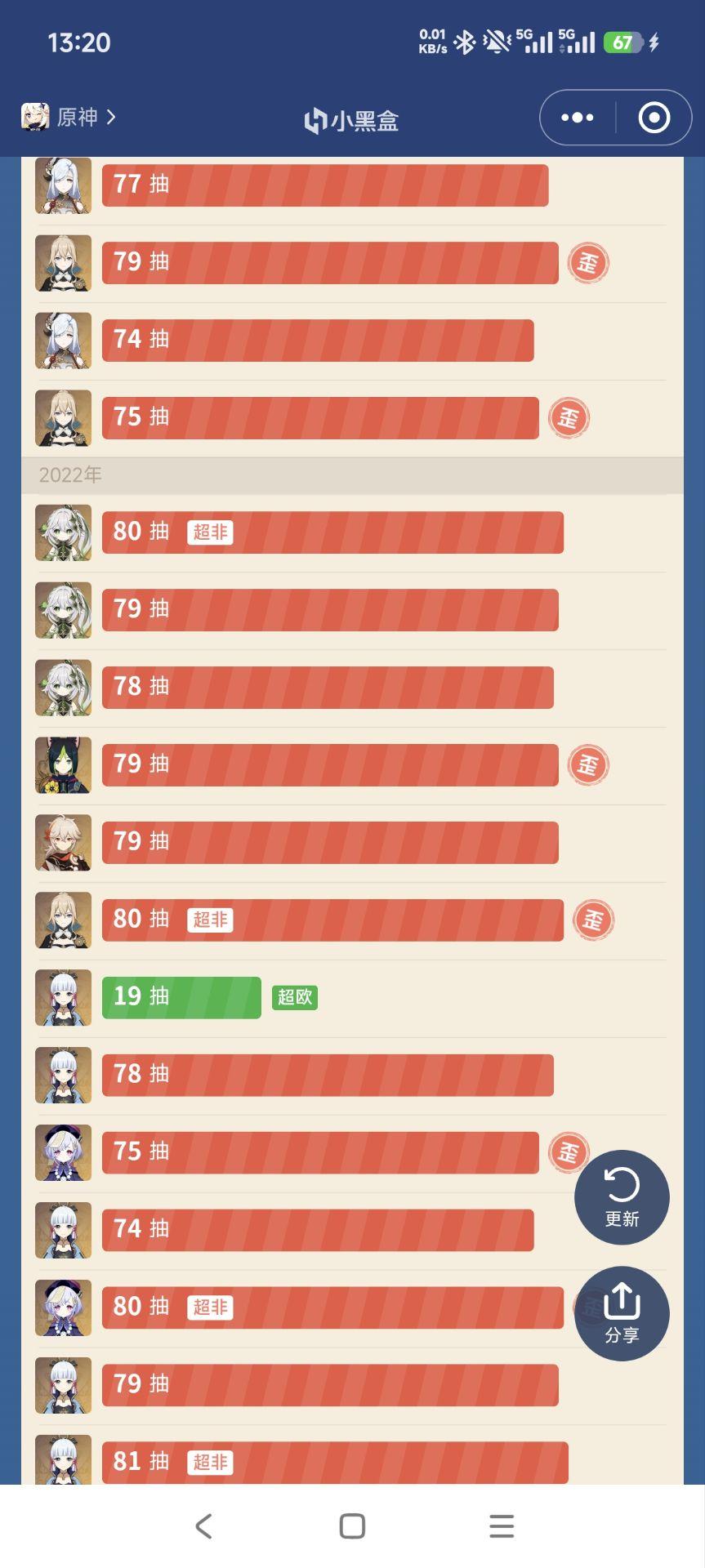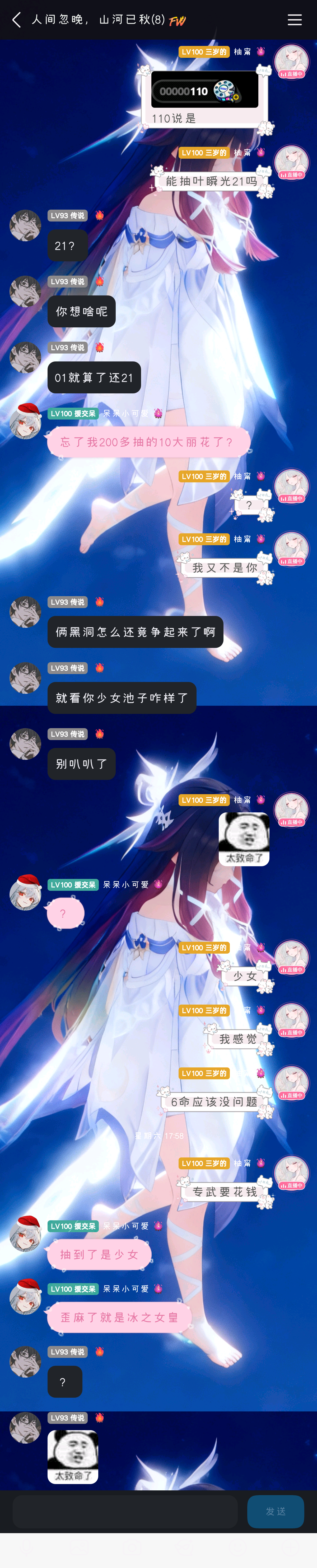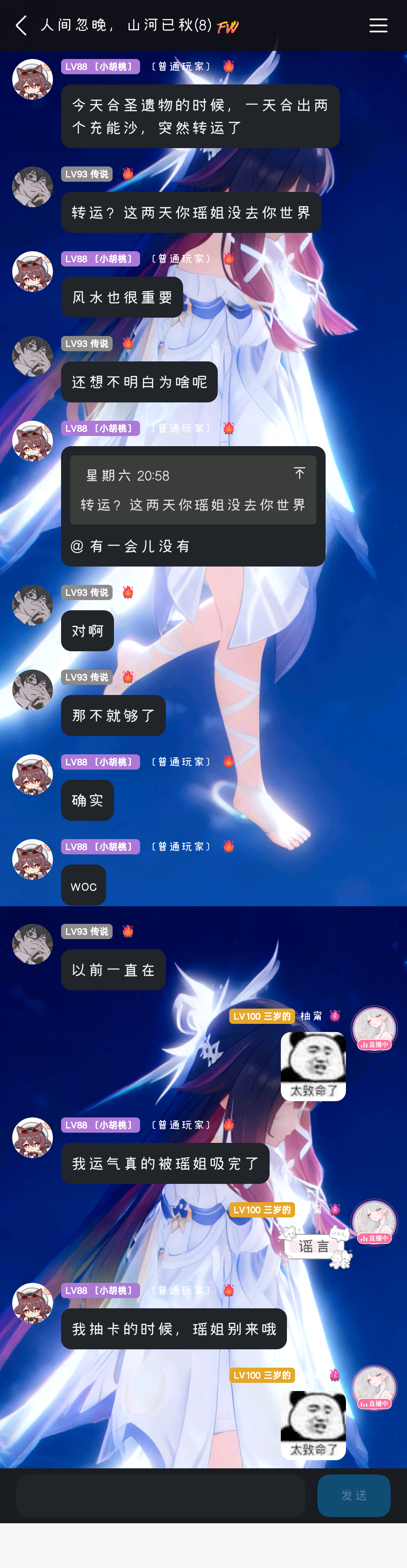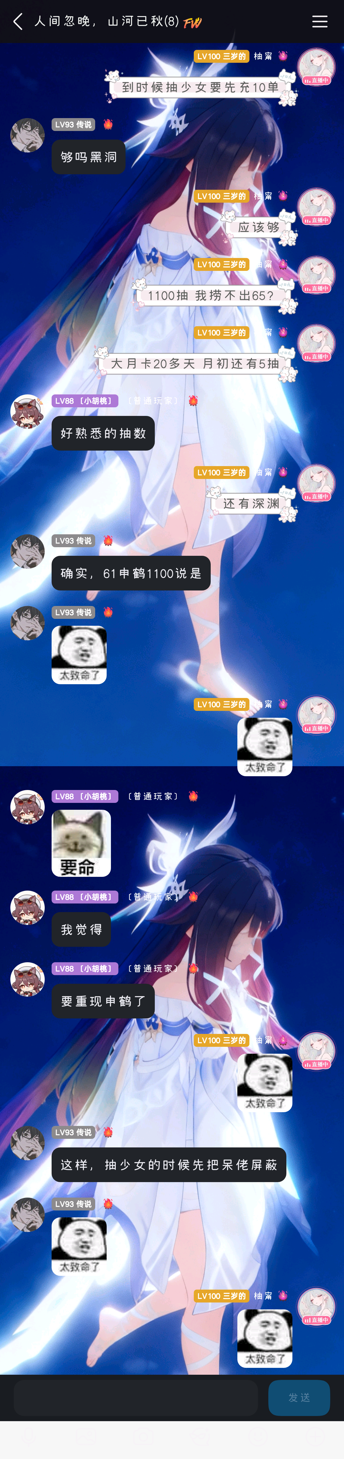 群里有俩抽卡黑洞(我和呆佬),又氪又肝。呆佬曾经61申鹤创下1200抽的壮举,我61申鹤也不遑多让大概1000抽,后面各种黑,包括但不限于捞女仆专武把万叶变成05,61千织800抽等等,剩下的61大多都是六百抽左右,所以被群友称为黑洞。前段时间,呆佬为了雅珂达,把杜林捞满了,算了下杜林61大概360抽,过了几天呆佬的崩铁大丽花池子300抽11,报应来了。而我因为上一个抽的恰斯卡
