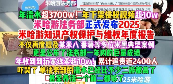 #今天游戏圈发生了啥 #资讯评论员 #米哈游 #崩坏星穹铁道 #原神 3月9日,米哈游旗下法务部通过官方渠道发布了《2025米哈游知识产权保护与维权年度报告》系统披露了过去一年在打击网络侵权与不正当竞争领域的战果,报告显示,通过刑事、行政、民事的组合拳,米哈游在2025年累计追责2388人,判赔或和解金额突破3700万元,并获得1240名侵权人的公开致歉在玩家提供的超10万条线索支持下,公司全
