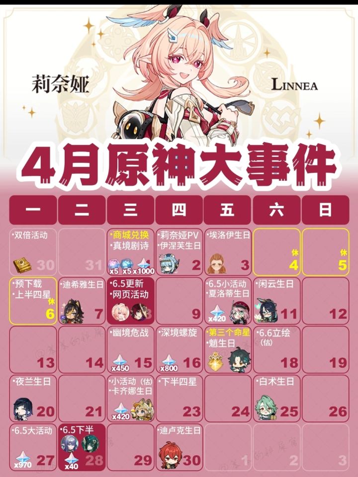 4月原神日程表已更新,6.5版本即将开启重点内容如下:4月1日:幻想真境剧诗新轮次开启,同时星尘兑换重置,记得清空5个相遇之缘和5个纠缠之缘。4月8日:6.5版本「月之六」正式上线,新五星岩弓·莉奈娅与复刻角色恰斯卡进入上半卡池。同期开放新地图“空之神殿”与荆夫港探索。4月中旬:幽境危战与深境螺旋更新,预计4月17日左右可白嫖第三个命星(需全勤)。4月28日:版本下半卡池开启,预计复刻菈乌