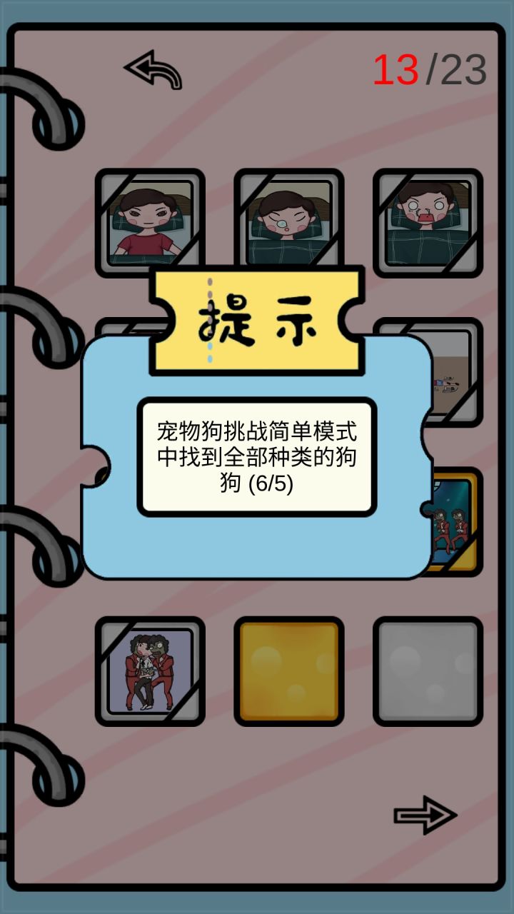 简单→普通→困难--1.起床点开所有眼睛→拉被子→同时点开所有眼睛2.123木头人诶?这个游戏你没玩过吗?3.僵尸跟随节奏♪4.宠物狗找到上图的狗→把光移到上边去看本关目标再找→把光移到上边找目标,注意本关是找一样的黑影来的5.抽纸抽就完事了→发现虫子摇一摇手机→虫子飞出来的时候按死(好惡噢)6.超市等男主走到相应位置再点击7.辣椒酱蓄力发射→瞄准发射→先让主角张嘴