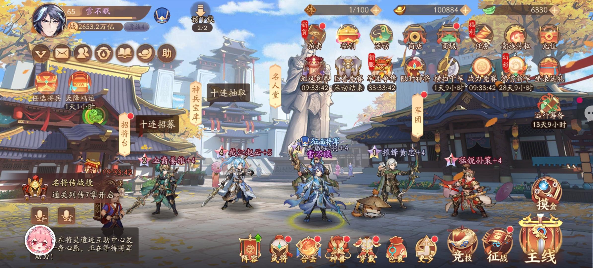 前几天刚回归,听说有联动所以回来看看!没想到送的东西意外让我惊喜连连😂,原3万6千亿,现在直升4万9千亿左右,目标直奔5万亿去的!😂,对了那个庆典回礼我看时间是剩下3天时间了!还能拿到一代天将吗?外界看的时间还剩18天左右,所以过来问一下!对了如果能拿到一代天将,我想准备把马超撤下去!混个魏国的一代天将,因为马超实在戳不动了!有大佬这么认为的吗?如有问题还请指点!