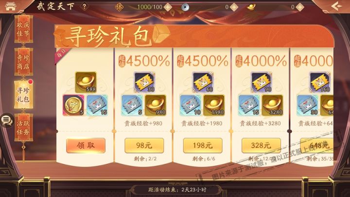 少年们晚上好呦!大家想念的限时神将来喽!这次奖励大升级,第一代苍金将们加入卡池!完整苍金神将等你来抽!参与横扫千军还可获得天金神兵东皇钟!难得机会,少年们快快行动吧!精彩抢先看❀限时神将,初代苍金神将加入卡池❀横扫千军开启,神兵东皇钟限时兑换❀限时神将❀活动参与时间:2023年12月5日00:00-2023年12月6日00:00活动天数:1天开启范围:开服大于等于8天的服务器均可参与