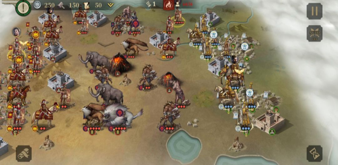 这关开局把你最高机动的将领按我这个路线跑到对面城旁边打一下引凯撒出来,然后就是集火把这俩黄圈打了,其余部队就去打火山跟炮塔不要打召唤物,打完两个黄圈将之后切记优先打城拿城不要跟炮塔耗,因为召唤物ai特别傻打城不占