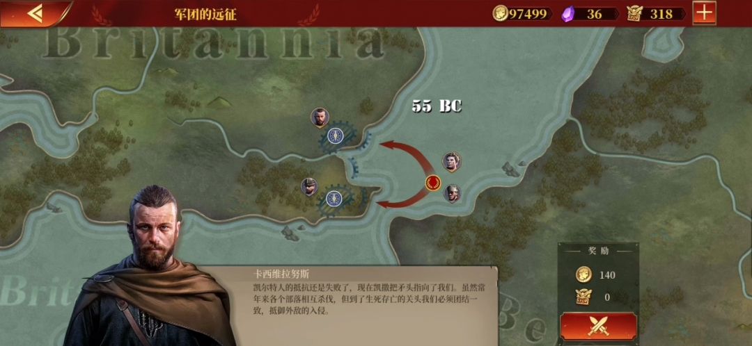 上篇剧情 没什么好写的,不太想写....... 主要是赶着写第七章。 好的,那就用当初写塞多留篇的手法写。 恺撒在这一年来不列颠“考察”,实际上是想要征服这里。——实在是太罗马了。 当然,不列颠本地人是不会乐意的。恰好恺撒现在要上岸,不如......把他堵在海上吧。 恺撒下达了突破防线的命令,而卡西维拉努斯的目标就是把恺撒堵在海上,当然要反击。 恺撒使用了他的传统艺能鼓舞。效果是拔群的,卡氏的目标