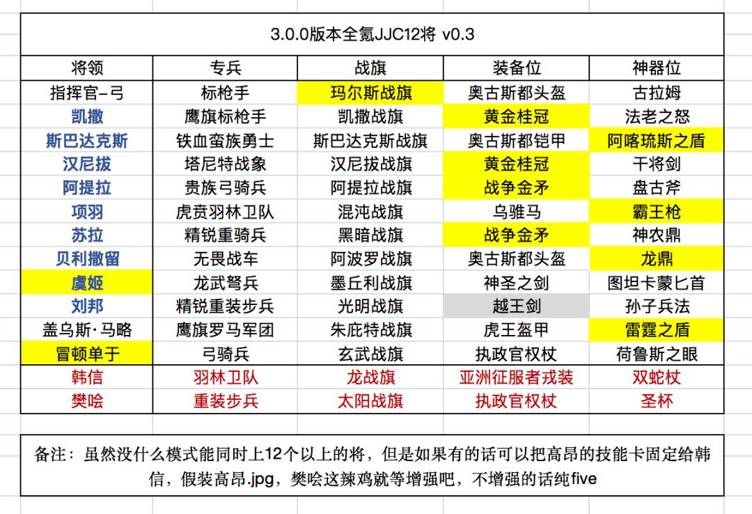 引言: 目前征罗3.0.0版本在各个平台均已更新(除了渠道服[表情_斜眼笑],建议渠道服的家人们还是早日离开渠道服脱离苦海),随着新版本到来的还有几件新装备与3位楚汉争霸时期的将领,为沉寂多年的征罗竞技场12将阵容注入了一摊活水。经与多位e社氪户激情讨论后,产生了一份全氪玩家用的12将阵容与装备明细,供各位玩家朋友参考。另外,该名单权当抛砖引玉,欢迎友善讨论~ (请各位黑武士碎片拥有者不要拿着图就