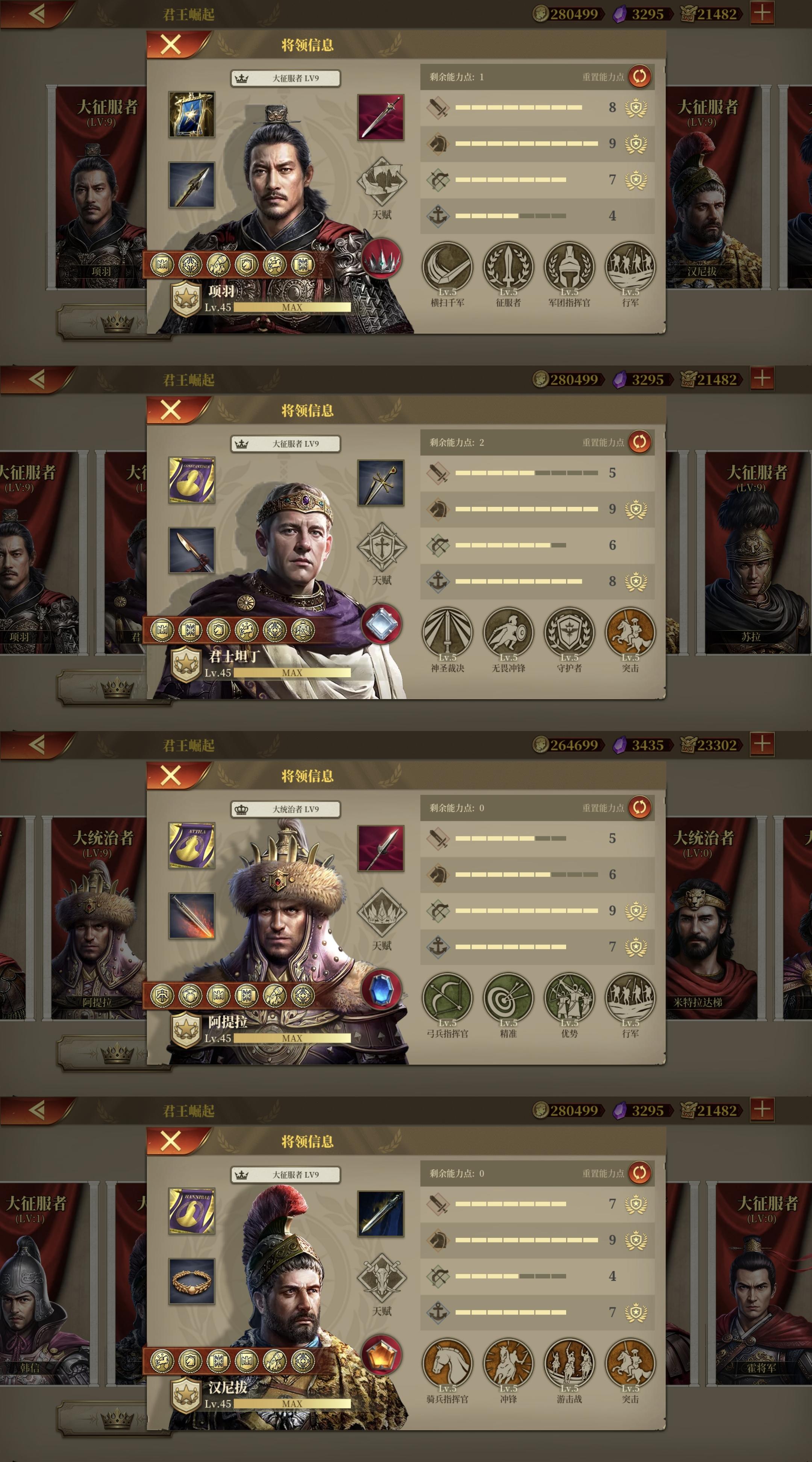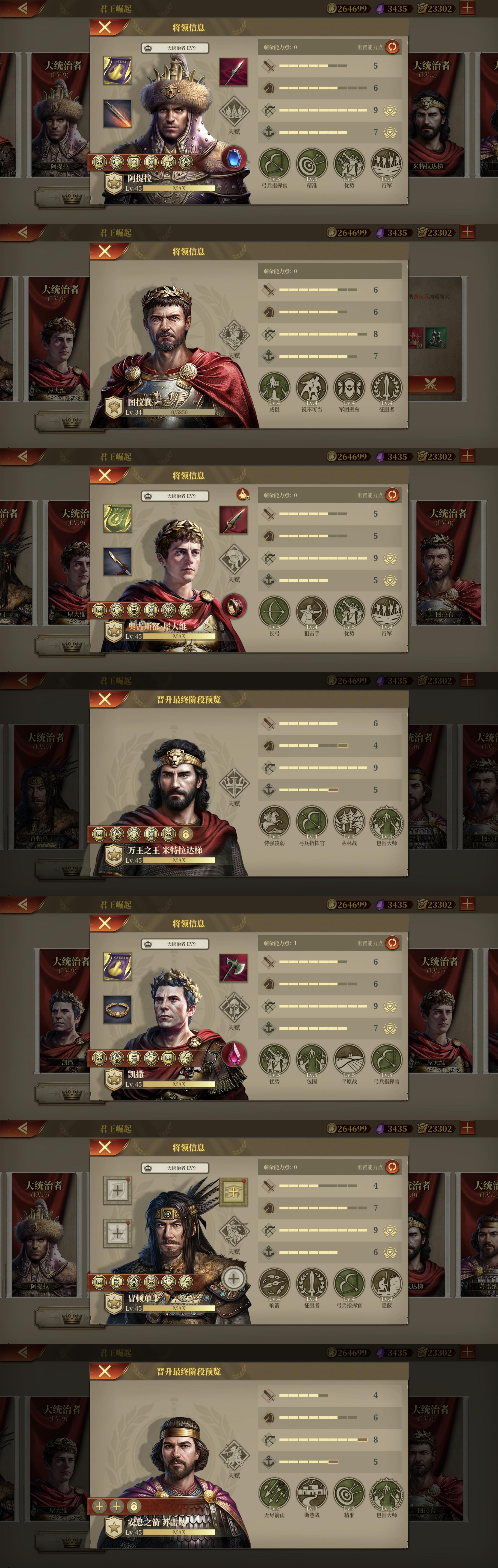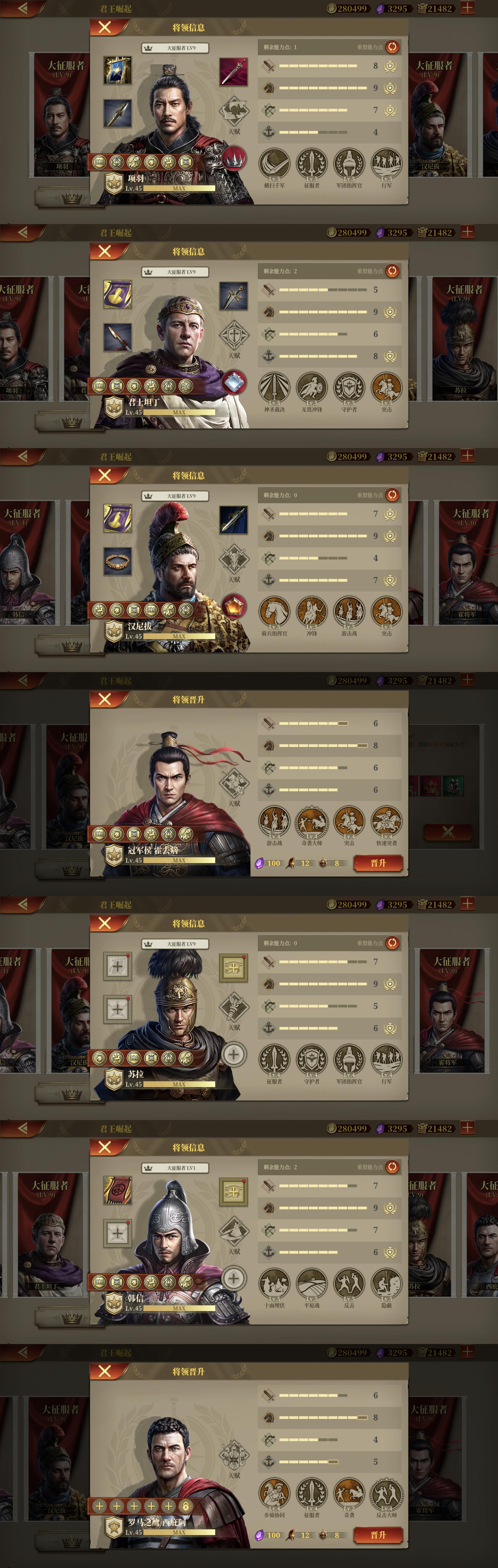 氪金推荐:项羽>君士坦丁>阿提拉>汉尼拔,想氪步兵可考虑刘邦骑兵将领:项羽>君士坦丁>汉尼拔>霍去病>苏拉>≈韩信>西庇阿弓兵将领:阿提拉>图拉真>屋大维>米弓>凯撒≈冒顿>苏雷纳步兵将领:庞培>维钦托利>刘邦>≈维斯帕先>斯巴达>马略>克拉苏