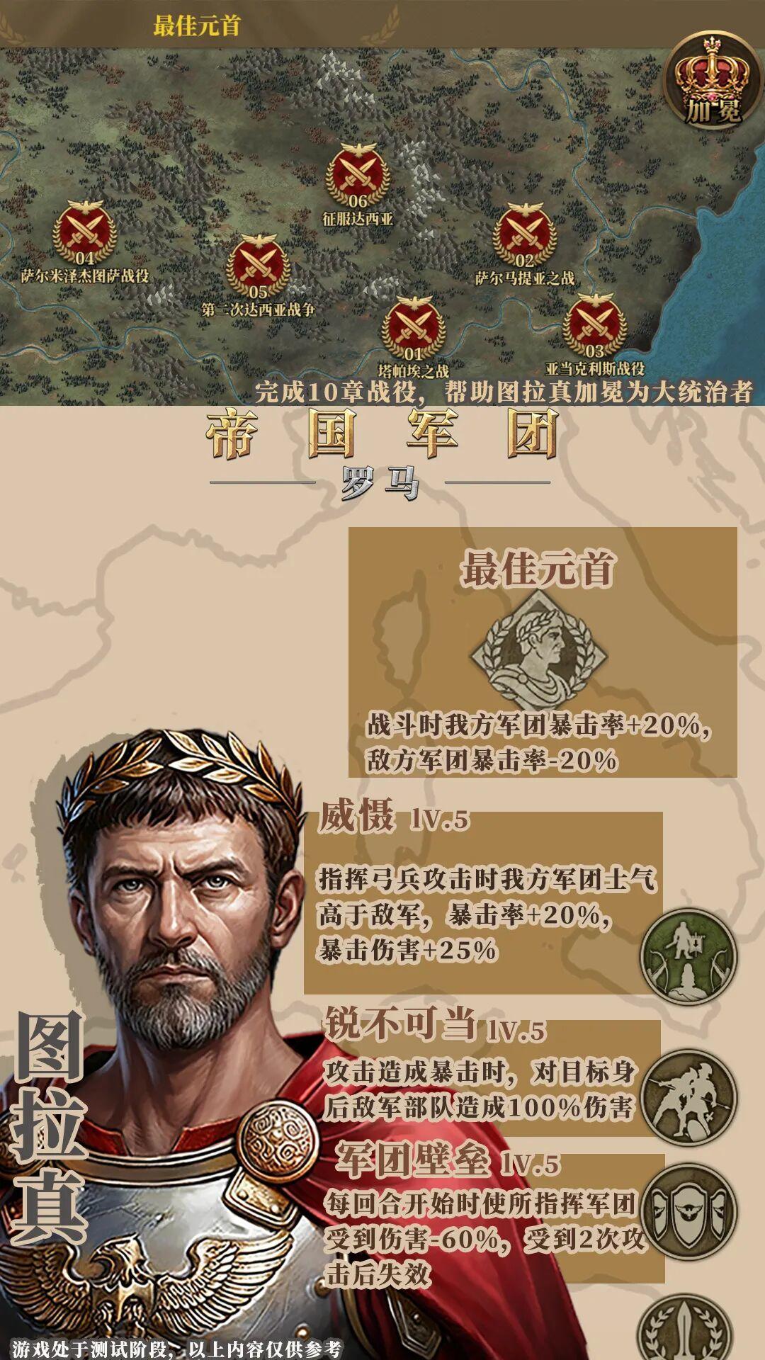 各位指挥官,大家好!元老院的号角再次吹响,鹰旗所指,即是荣耀所向。在即将更新的《帝国军团:罗马》3.6版本中,我们将迎来一位全新将领以及新一批将领晋升。一起先睹为快,看看本次更新都有哪些重点内容!【新将领:盛世罗马,最佳元首】“愿你像奥古斯都一样幸运,像图拉真一样优秀。”他是罗马“五贤帝”之一,是被元老院和人民共同拥戴的“最佳元首”。在他的统率下,罗马帝国的疆域东起两河流域,西至不