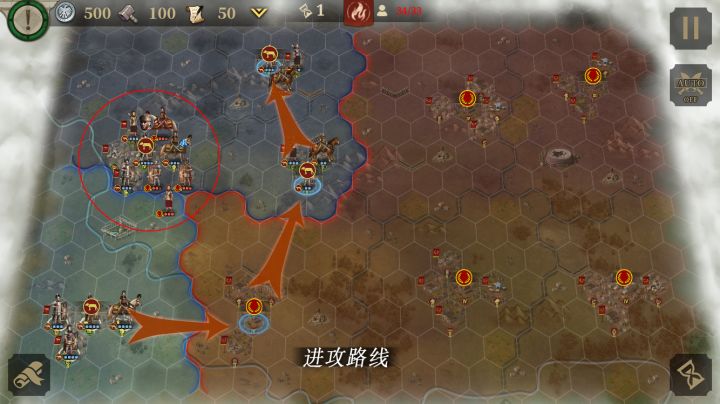 3.(进攻路线)上方红圈城市和右侧红圈城市占领会敌军
