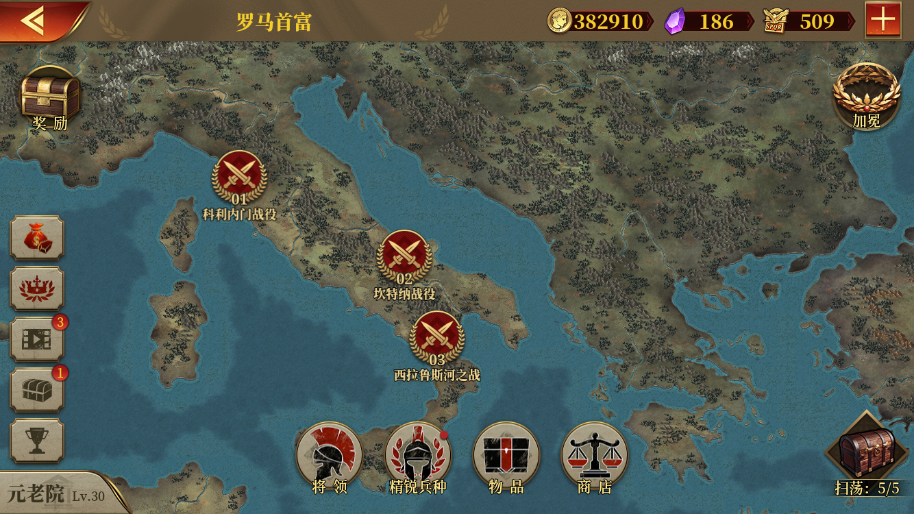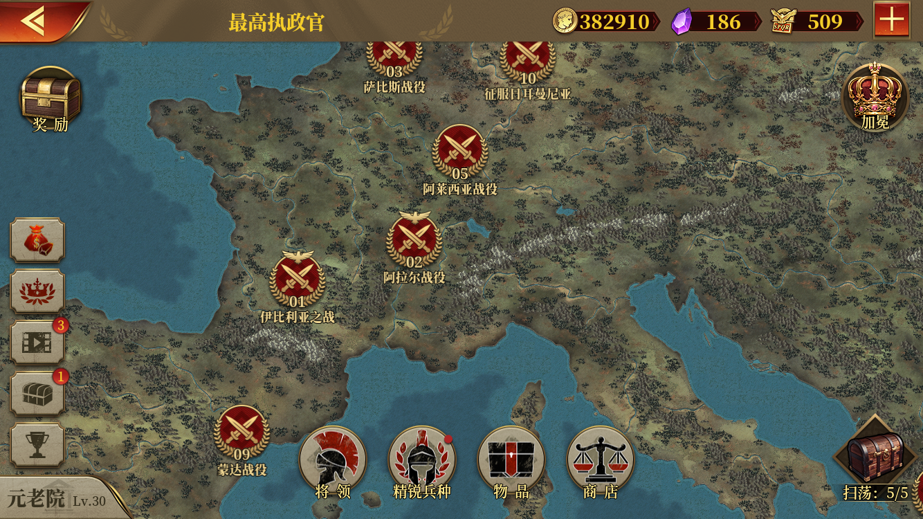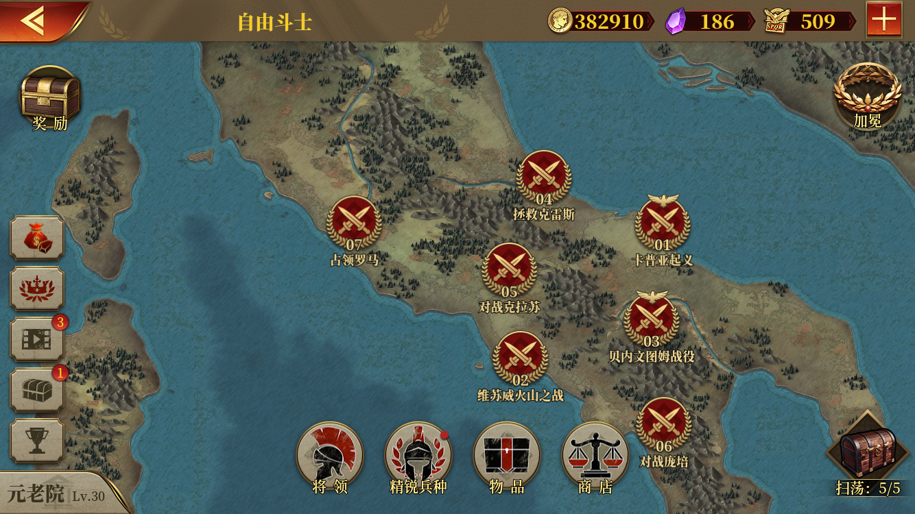 终于五扫荡了。个人觉得凯撒、克拉苏、斯巴达克斯比较简单,凯撒第十二关和斯巴达克斯第七关比较难,但多打几遍能过,界屋6级勉强能过。帝国军团罗马零氪君王崛起扫荡,个人推荐先打以上三个。