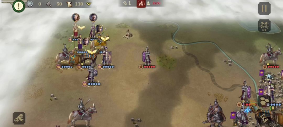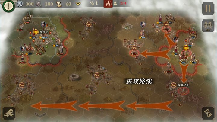 第一关还是死守简单吧。我试过偷了左下角的城,结果根本没有怪来,反而全从中间穿过来,把上面的城给我推掉了。所以直接把开局的兵都上个将,用开局的兵打下4个关键城就可以防守一波。一局下来也就大概可以造出2个3血标枪兵,先造一个米弓标枪守右下角,再造另一个标枪出来守中间的关键城。这个时候,就可以把开局给的兵往前压了。当然如果你将好,可以在造出第二个标枪之前就把4个关键城打下,用上了将的杂兵加弓兵守城,用重骑把那中间的两个城吃了后再回防,因为这两个城的仇恨值低,防守力量也不用太强,随便拉个轻步守一下就行。科技只要近卫加总督,有多的话可以点个水泥。