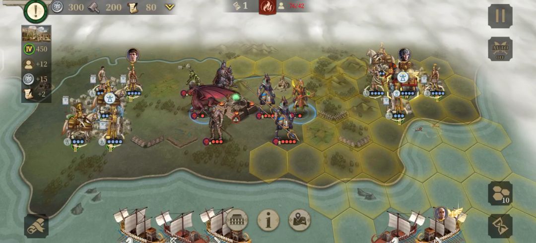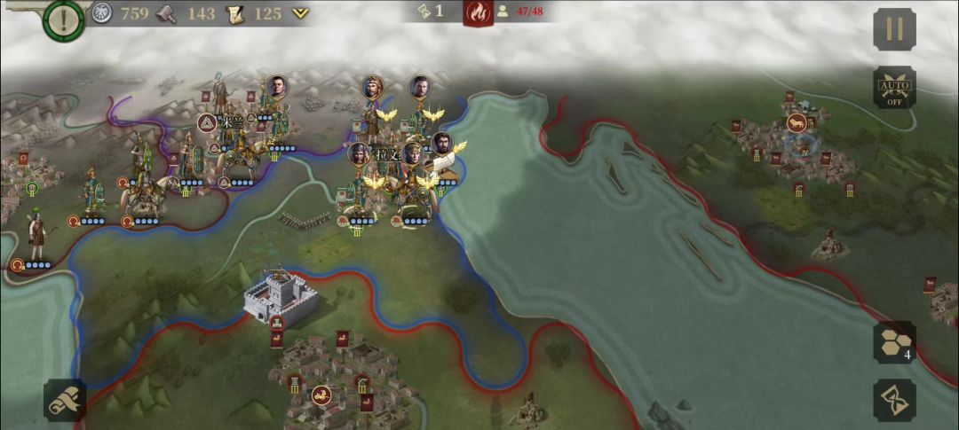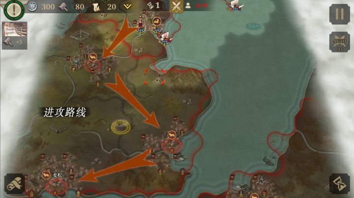 本官的目标是拥有3个关键地区,击败3支关键部队,12回合内达成目标。本关敌军比较多,在攻城的同时要注意守城。首先按照路线攻下第一个城,这是一个5级城,可以很好的补给部队。出生城可以出一些投石兵来防守。海上有地方部队过来攻城,击败海上的敌方将领后会触发剧情所有敌军士气下降,对我们陆地主战场的进攻和