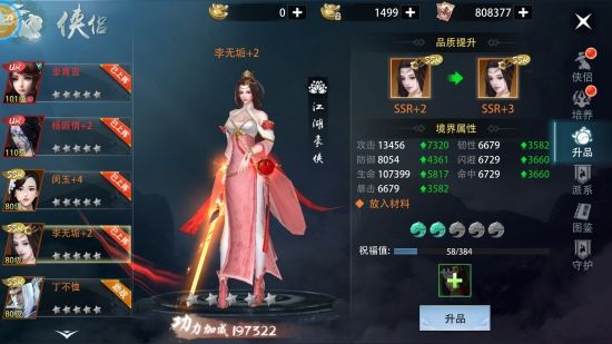 上期主要介绍了侠侣的人物生平以及拥有的技能效果,那么今天我们就来看看如何培养侠侣吧升品 游戏内侠侣的品质分为N-R-SR-SSR-UR-SUR六种,培养的方式主要是通过雄霸九州副本以及珍宝阁抽奖来获取侠侣碎片,然后在游戏内的升品界面上进行提升,提升侠侣品质可以提供大量的功力加成派系 侠侣们一共划分为三个派系,分别为江湖豪侠、天都猛将以及乱世枭雄,集齐四个同派系的侠侣即可激活派系心法启用派