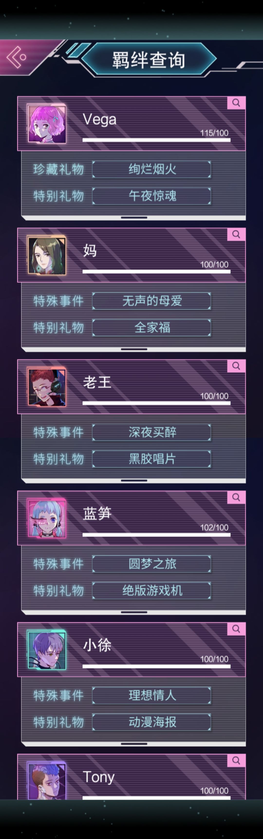 刷礼物 Vega p2:【烟花大会影像带查看权、恐怖片《闪灵灵》查看权】 妈妈 p3:【玉蝉胸针】 老王 p4:【老旧的黑胶唱片 】 蓝笋 p5:【GaaameGirl50游戏机】 小徐 p6:【偶像动漫加厚海报 】 Tony p7:【义肢零件】 星野 绫 p8:【星空手链、枫木小提琴 】,ps🧐要解锁她特殊礼物——悠扬琴声,在第七章 破碎 这个章节,会出现小提琴,一定要买枫木小提琴🎻(前期怎么