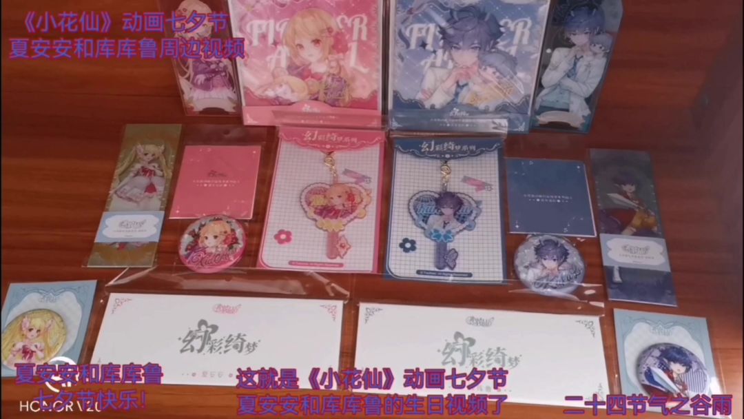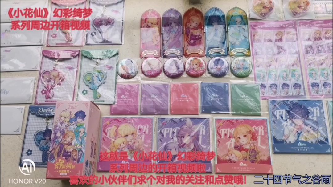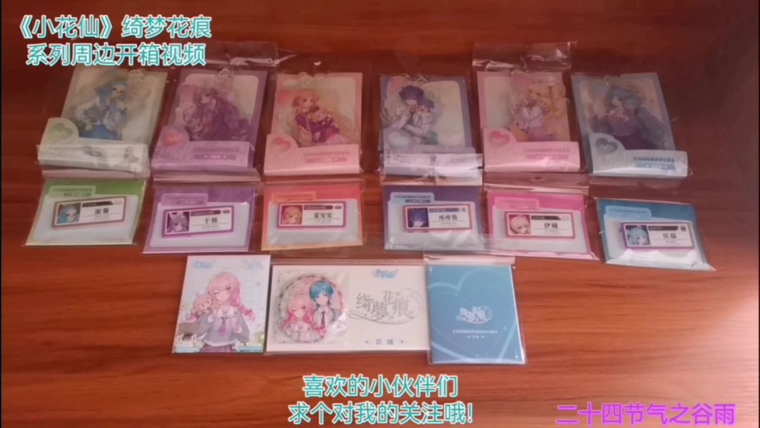 《小花仙》幻彩绮梦系列周边开箱视频,两个月前预售下单。十天前陆续拿到手后,今天终于有时间来拍一下开箱视频。幻彩绮梦这次是以夏安安、千韩、伊瞳、淑馨、库库鲁登初代角色团为主的,有相卡、胶片、钥匙扣挂件、镭射票、亚克力色纸。还有戒指和手链,以及盲盒马口铁徽章吧唧和盲盒彩窗屏风亚克力活页书签立牌等。因为是初代角色的盲盒,所以吧唧和立牌我是一套端盒的。BGM是第一季动画的片尾曲彭彭彭舞曲,喜欢的小伙伴们求