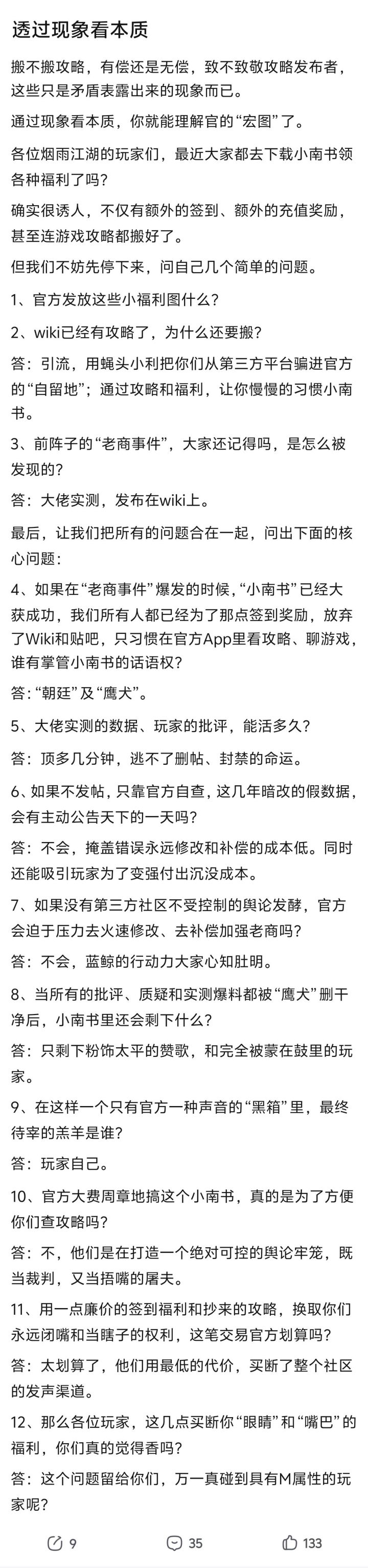 总结 - 「官方剽窃Wiki攻略」事件引发众怒,玩家纷纷指责蓝鲸工作室“鸠占鹊巢”。同时,运营被曝“开盒”玩家隐私及删帖控评的操作让口碑跌至谷底,不少老玩家因“策划不当人”选择提桶跑路。
