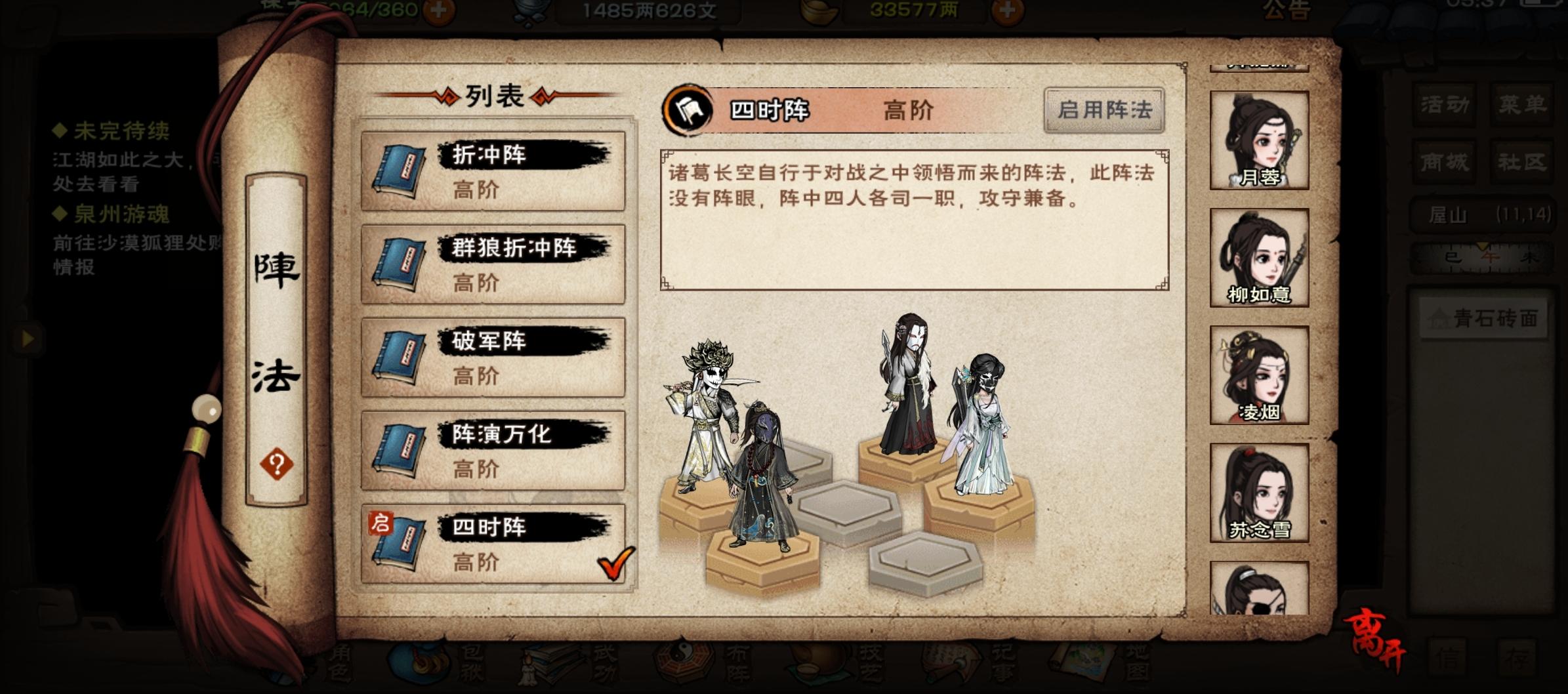 四时阵就是强化版的阴阳阵,不用两男两女,适合整体偏肉的队伍。 少阳为其他成员提供防御加成,太阳为加其他人提供罡气加成,少阴为其他人提供内劲加成,太阴为其他人提供回血加成。各加成需对应位置的人存活才能生效。