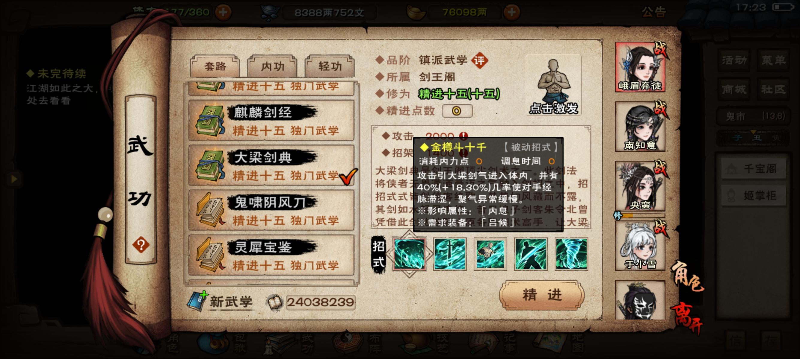 除了少林的武学和秘技外其他的都已经拿光了,所以想总结下烟雨江湖一些东西。(后续小号少林毕业会补上) 剑法: 泠月剑法(一阶师傅齐无月学习) 越女剑法(二阶陆灵云学习) 倚天剑法(三阶梁嫣) 舞殇剑法(四阶周清澜) 拳法: 瑶莲掌法(一阶师傅齐无月学习) 飘雪穿云掌(二阶梅笑尘) 邀月掌法(三阶赵南箐) 落英拳法(需学习月心寒魄诀后找赵月清) 天暮残月掌(四阶周清澜) 内功: 泠月心法(一阶师傅齐无