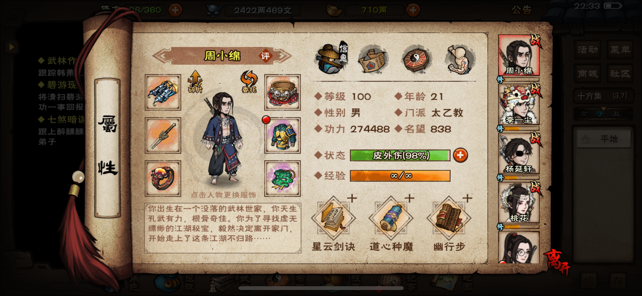 我的邀请码AAFYFG,以下是萌新40级前可以做的事 副本及NPC仅显示副本等级,非等级限制;故推荐战力并不具有确定性,等级指的是主角等级;随从可超过主角两级。 10级: 武馆指点 初级 (3回合内获得4000阅历) 加入门派少林寺(仅男),泠月宫(仅女),太乙教,天刀门,苍狼门 学习垂钓,炼丹,道学,佛法,音律,冰心诀,烹饪各种技艺。(请移步技艺与秘技) 非泠月宫弟子可以通过赠送礼物